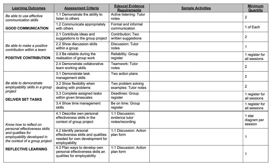 De portfolio focust op vier categorieën: effectieve communicatieve vaardigheden, positieve bijdragen binnen een team, het aantonen van werknemersvaardigheden in een groepsproject en het reflecteren over persoonlijke effectiviteitsvaardigheden en tewerkstellingseigenschappen. Er is geen examen. Als het portfolio voldoende bewijs levert dat iemand deze vaardigheden heeft vertoond tijdens een creatief project, krijgt de deelnemer een certificaat. Het certificaat dat iemands werknemersvaardigheden beschrijft, kan worden gebruikt bij het solliciteren voor een baan. Onderzoek aan de universiteit van Exeter (2008, Jo Cursley, Marchmont Observatory, Universiteit van Exeter) onderbouwt dat de vaardigheden in dit certificaat, de vaardigheden zijn die het meest worden gewaardeerd door werkgevers.