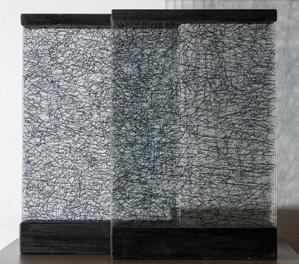 Čorda, Inkluzija starosnih krakelira, 2025. instalacija - flomaster na staklu, drvo, 34.8 x 21 x 8.4 cm