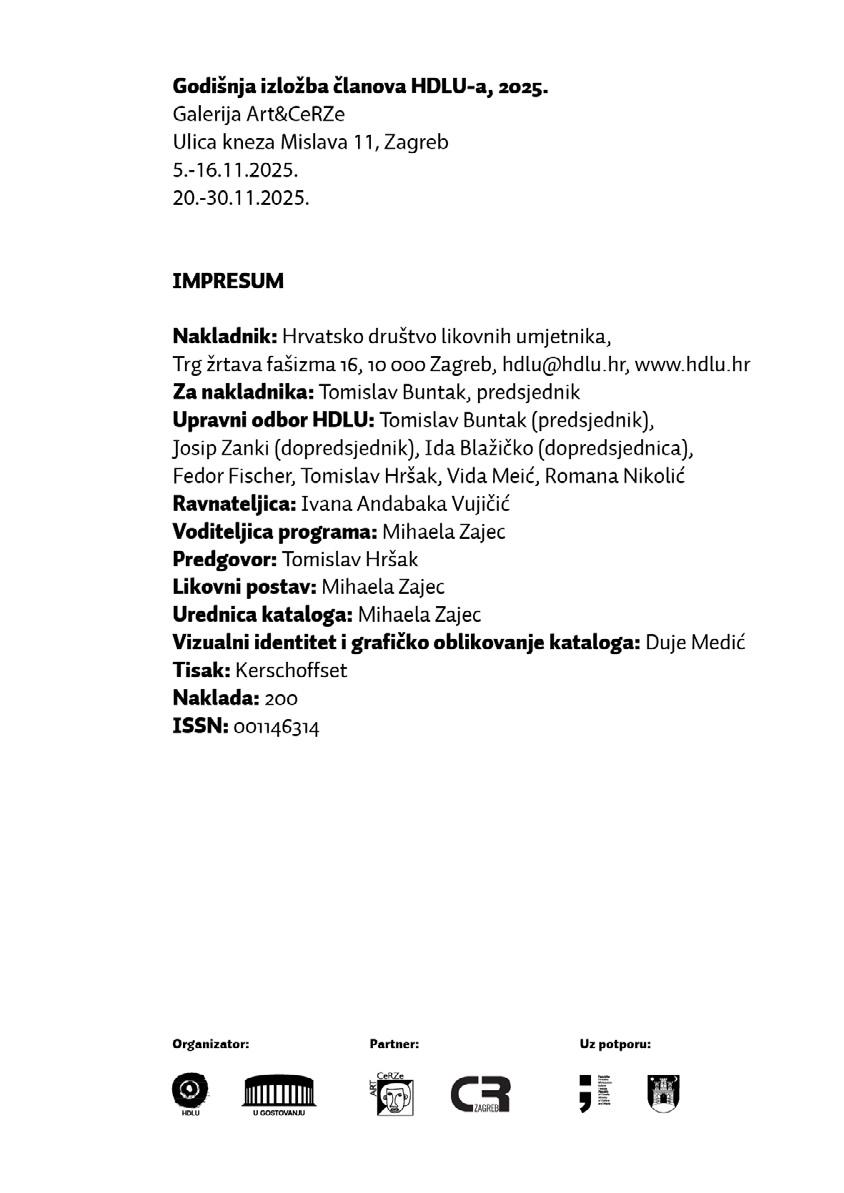 Tradicionalna, Godišnja izložba članova Hrvatskog društva likovnih umjetnika održava se u Galeriji Art&CeRZe u dva termina, od 5. do 16. studenog te od 20. do 30. studenog 2025. godine.