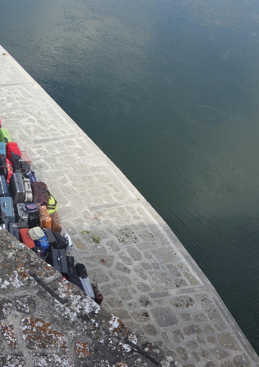 The video installation Compositions of Flow (2023) invites viewers to look from Regensburg’s historic Stone bridge toward the Danube, where water streams past a massive pier—suggesting motion and change while the pier itself remains firm and stable. This visual metaphor articulates the inner tension and ambivalence many migrants experience when contemplating the decision to leave their homeland – how their lives change, to what extent they improve, and which alternatives remain open. The installation, inherently site-specific, strategically links the historic bridge, a symbol of transition and movement, with Maximilianstraße, the main pedestrian and traffic axis of the contemporary city, underscoring the ways in which migration generates and reshapes the dynamics of urban space. Project participants actively contributed to the installation by donating or lending personal items – suitcases symbolizing transition, travel, and the baggage of life – which were later transposed into the video format.