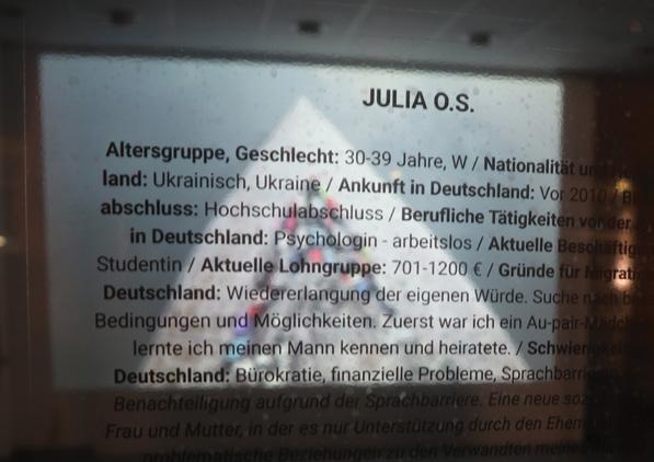 „Trenutno sam vrlo kritična prema sebi i osjećam se depresivno, iako imam sve što mi je potrebno za uspjeh. Želim se vratiti u Ukrajinu jer ovdje nakon godinu dana nisam postigla mnogo profesionalnog napretka. Teško je odrediti jesu li stvari postale bolje ili gore. Financijski sam bolje nego u Ukrajini, ali me u Njemačkoj sram moje plaće. Ovdje sam sigurna, ali sama, bez svoje obitelji. Samo želim imati mogućnost vratiti se kući u bilo kojem trenutku.“