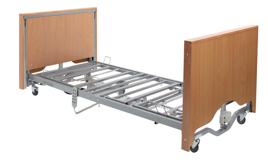 The Casa Elite Home Beech Low Profiling Bed, equipped with four sections and electric features, can be lowered significantly closer to the ground compared to a typical profiling bed.