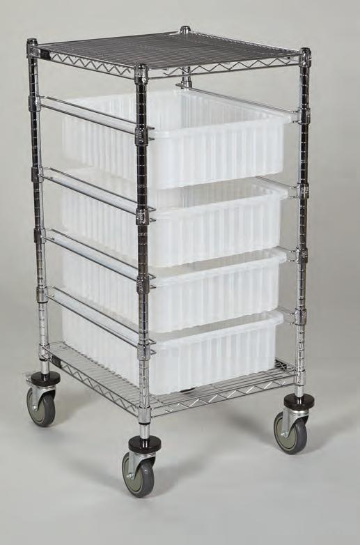 Rail system can accommodate up to 8 baskets or trays. Baskets and trays can be angled to create a gravity-fed system. Weight capacity - 176 lbs. evenly distributed Casters - four swivel, two locking Assembly required