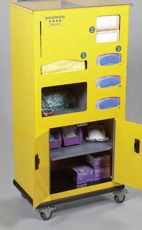 Construction: Multiple holders of various sizes for PPE boxes and back stock Process indicators provide visual cues for proper donning order.