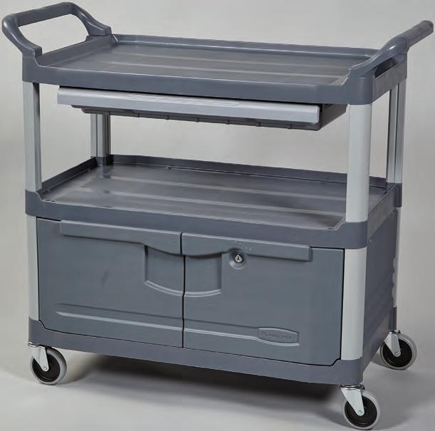 Supply Cart Material - Industrial grade polymer Construction: Shelf panels swing up and latch in place to provide a box border. Handles include three small compartments, one large compartment and one cup holder compartment.
