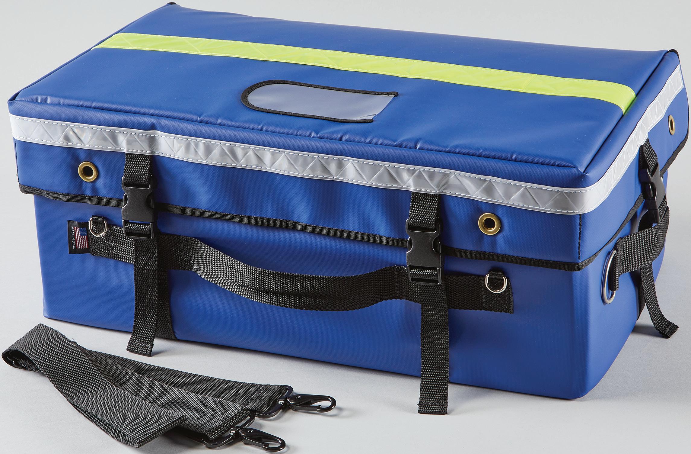 Material - Tarpaulin with a urethane coating for easier cleaning and protection from the elements. Bag is foam lined to protect EMS equipment from breakage. Internal Velcro® strips help secure modules.