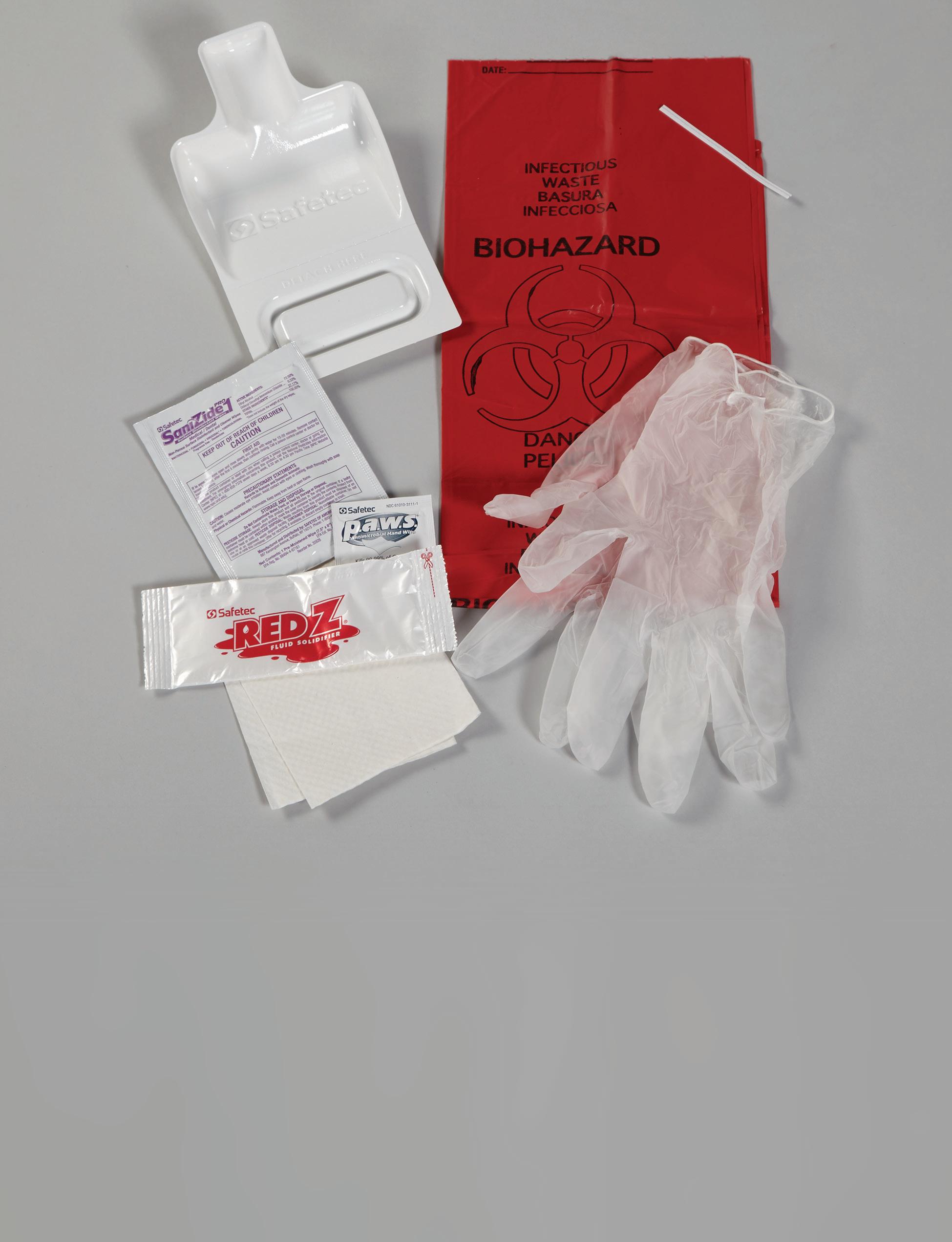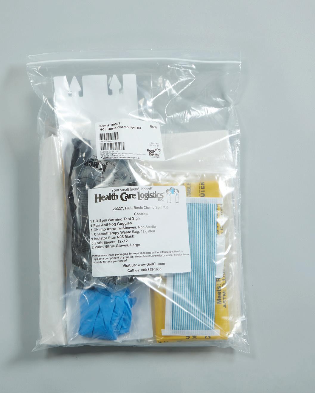 Basic Chemo Spill Kit Includes: Impervious Gown (1) Chemo-Nitrile Gloves (1 Pair) Impermeable Mask with Safety Shield (1) Chemo Bio-Wipe Bag™ (1) Absorbent Towels (3) Hard Surface Disinfectant Wipe (1) Chemo Waste Bag with Twist Tie (1) Antimicrobial Hand Towelette (1) English and Spanish Instructions (1) B SHIPS GROUND ONLY Chemo Clean® Product All ITEMS