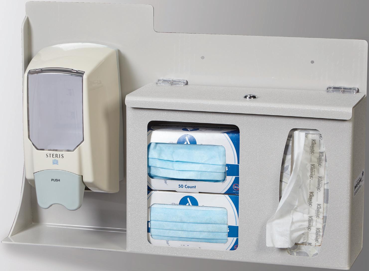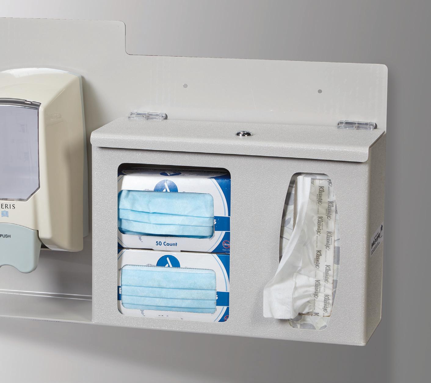 Encourage Good Hygiene - Provide convenient access to hygiene items for droplet protection in primary care areas. Holds up to three boxes of face masks, tissues and/or gloves and a bottle of hand sanitizer. Lock includes two keys. Includes two mounting holes for hand sanitizer dispenser (not included).