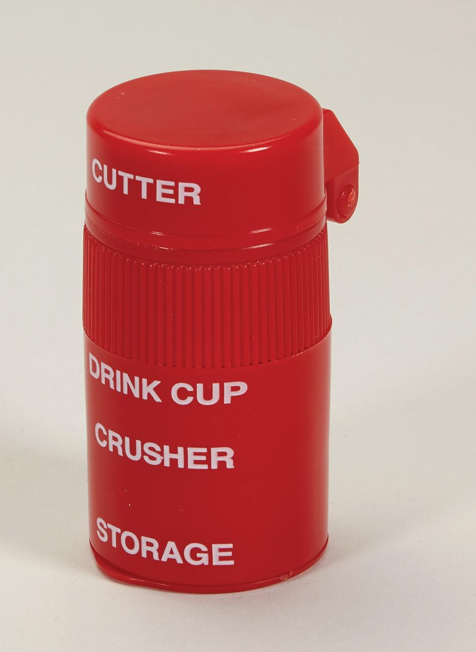 Multi-Function Device - Tablet crusher, tablet cutter, drink cup and med storage container with bold print to identify functions.