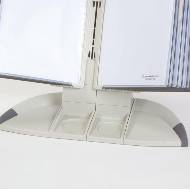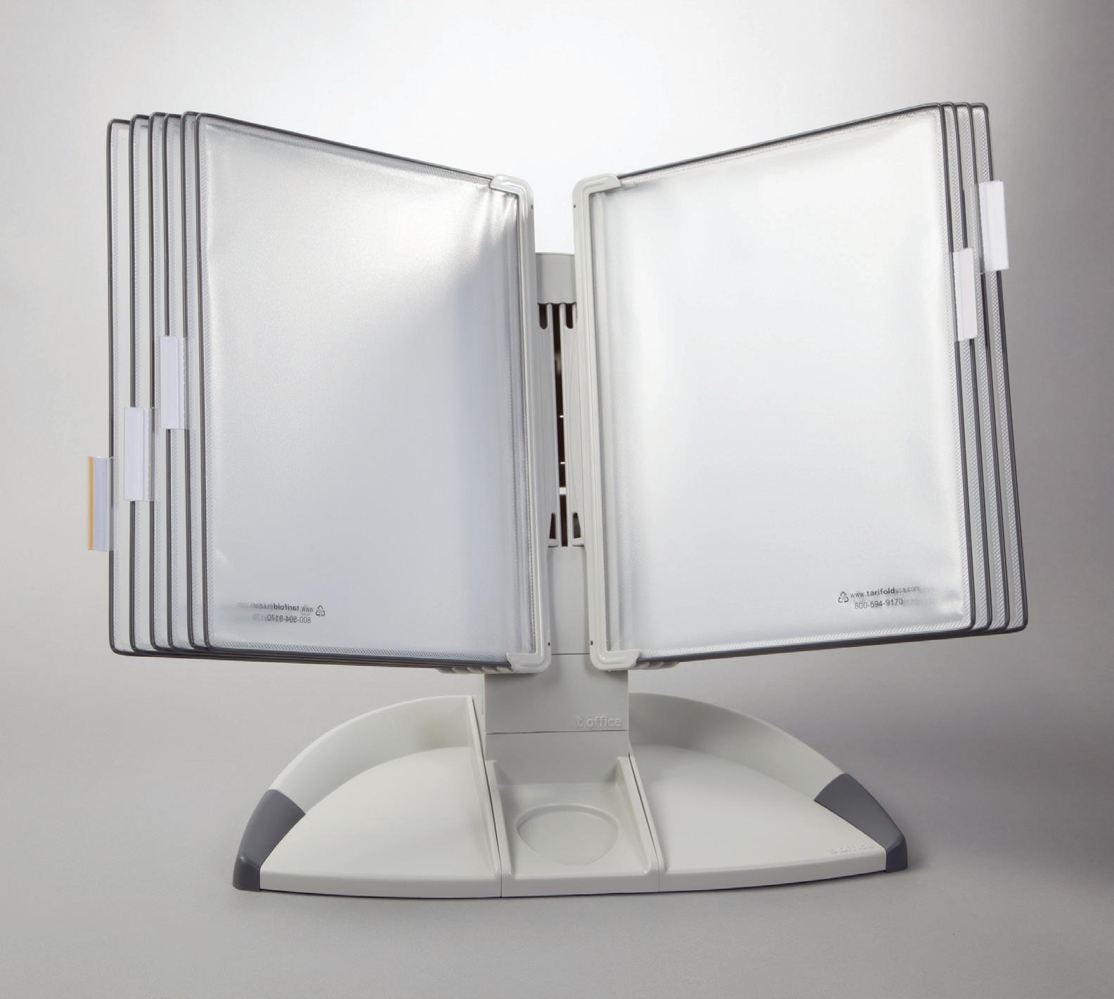 Freestanding - Base keeps documents in the easy-to-view and flip through sleeves. Includes: 1one base, two support feet, 10 sleeves and five identification tabs.