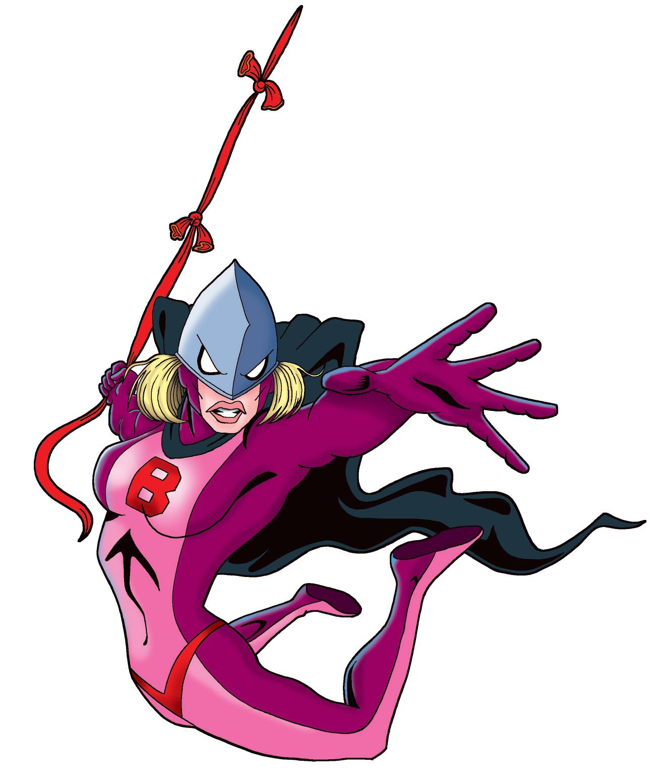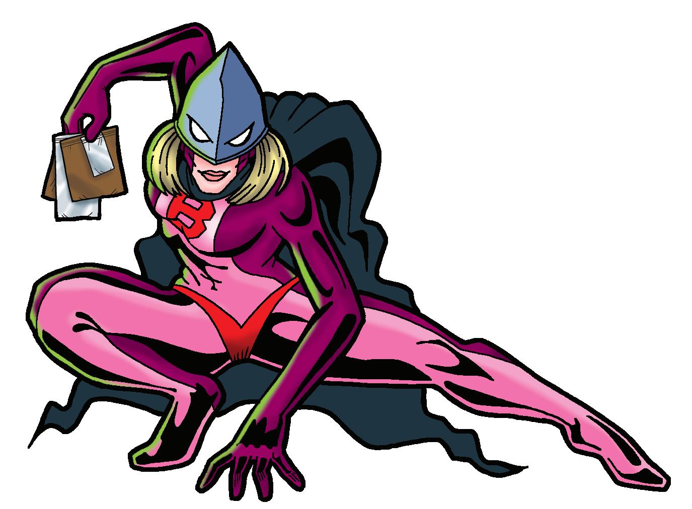SCARLET FIRES THE NET GUN AGAIN. THIS TIME, SHE HITS BAGMAN AND HE FALLS TO THE FLOOR IN A TANGLED MESS.