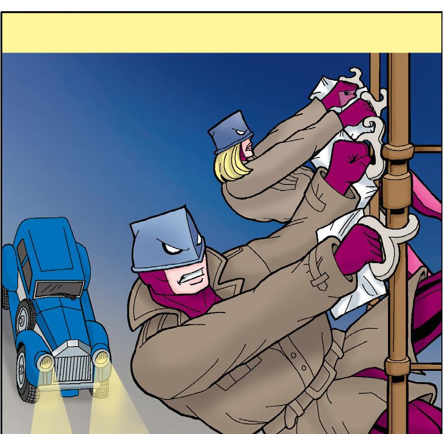 BAGMAN AND BAGLADY USE THE HOOKS FROM HANGING PRESCRIPTION BAGS TO SCALE THE SIDE OF THE FACTORY.