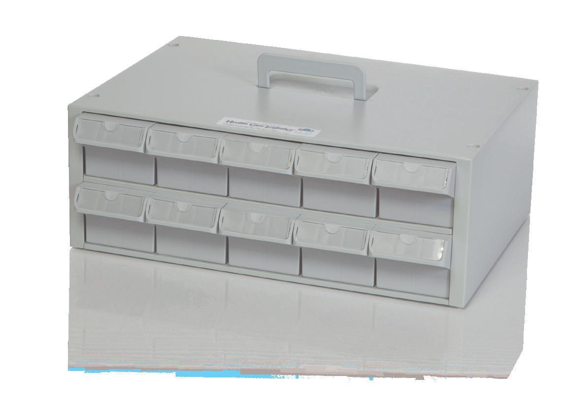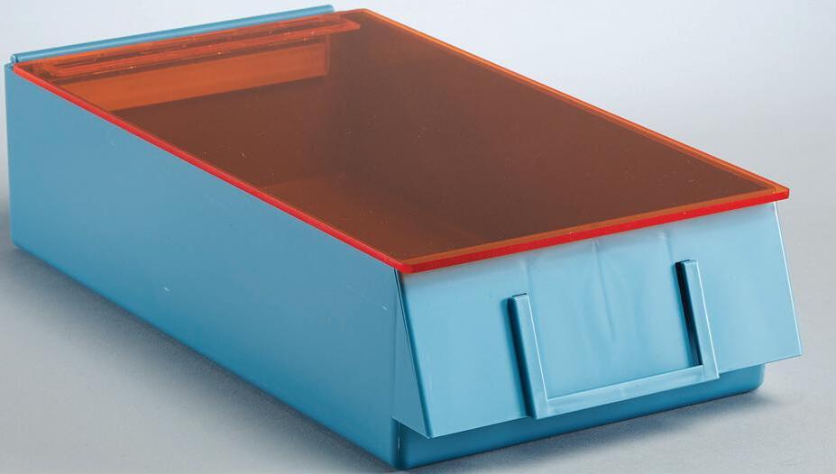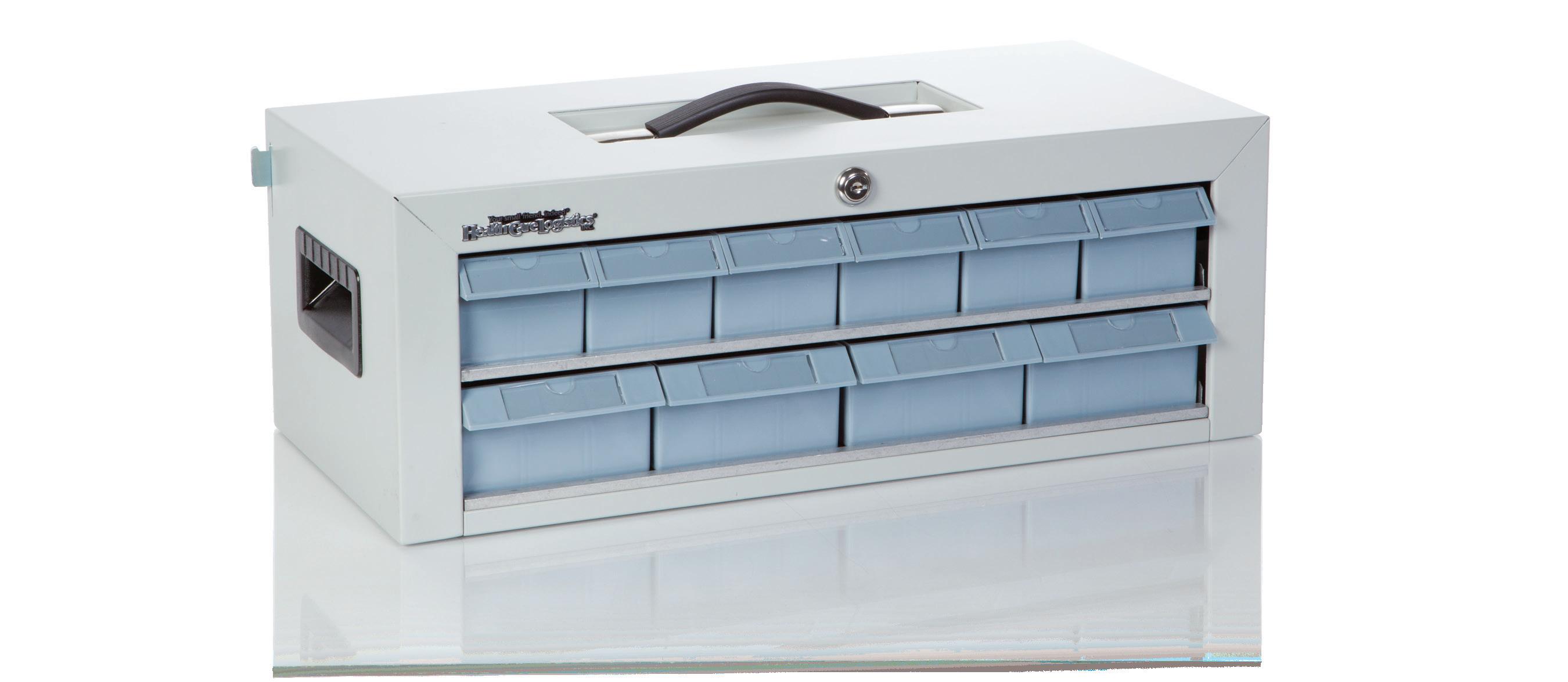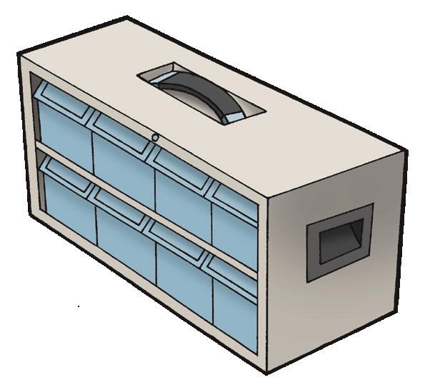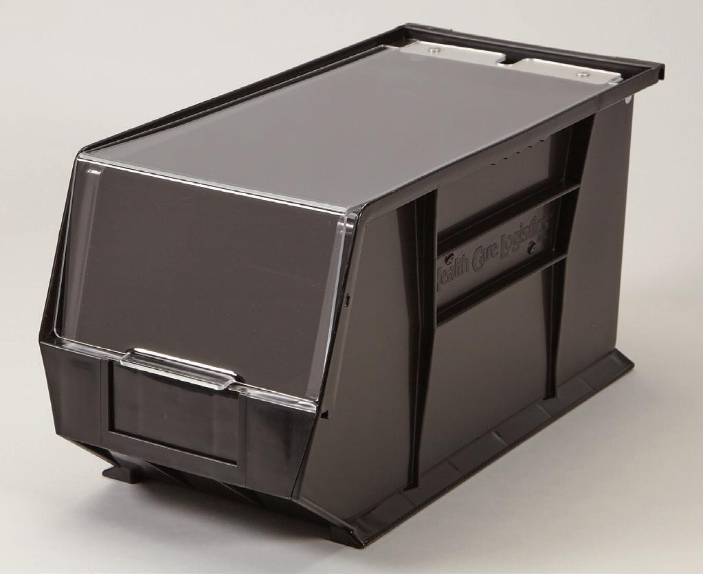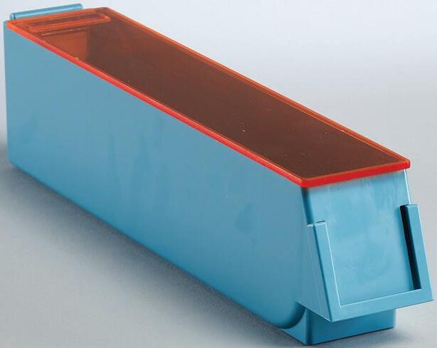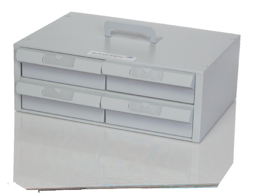 Carrying handle collapses to allow cassettes to be stacked. Built-in tension springs keep bins from falling out during transport. Protective lenses included with each bin.