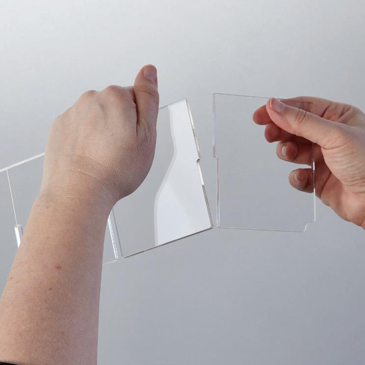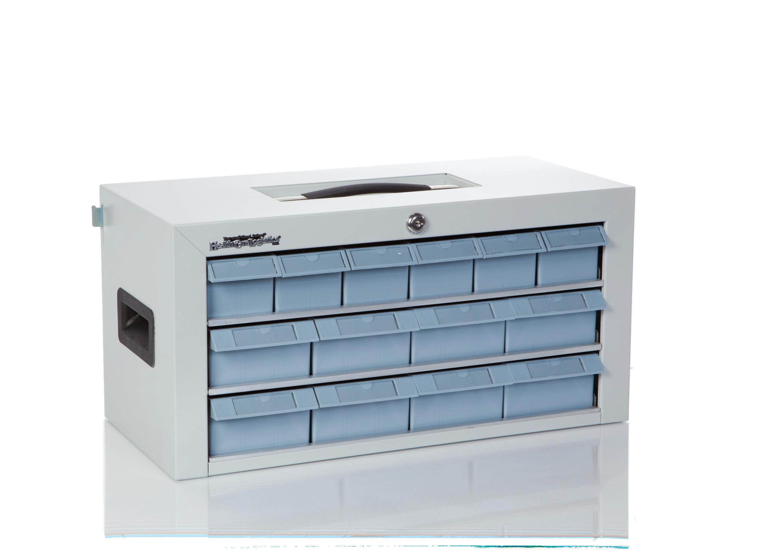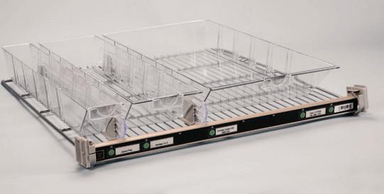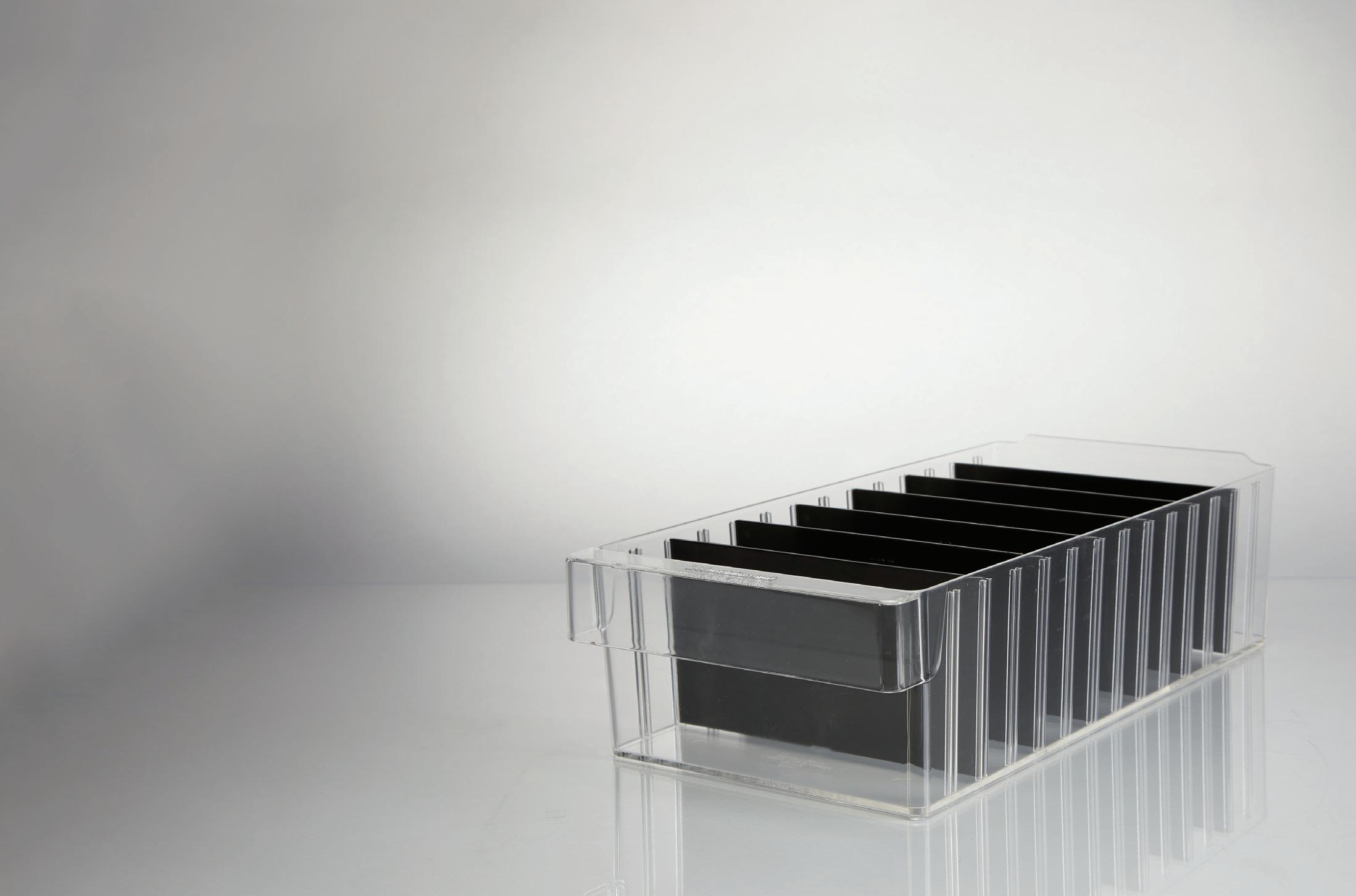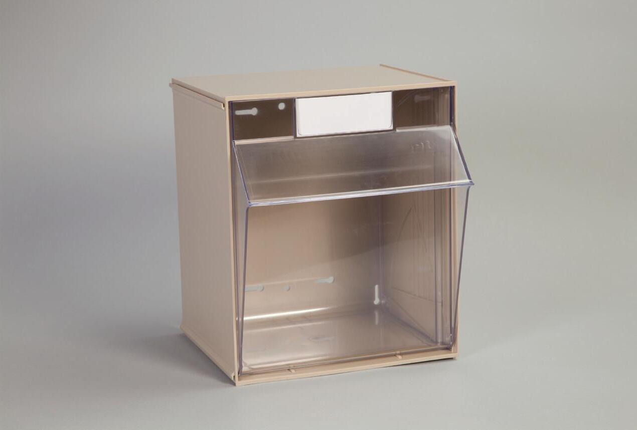 Carrying handle collapses to allow cassettes to be stacked. Built-in tension springs keep bins from falling out during transport. Protective lenses included with each bin.