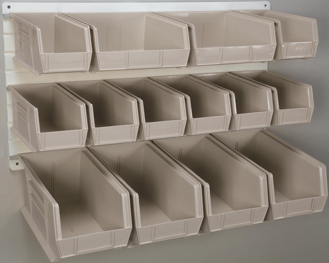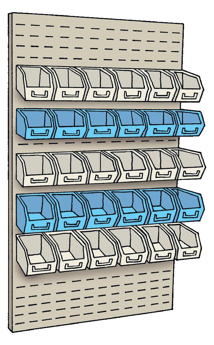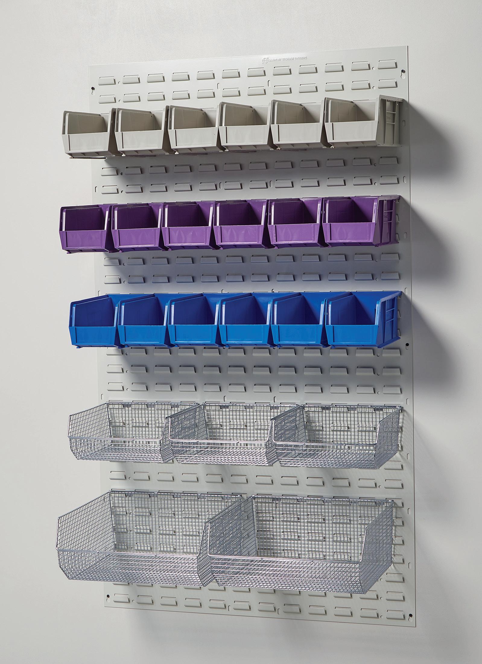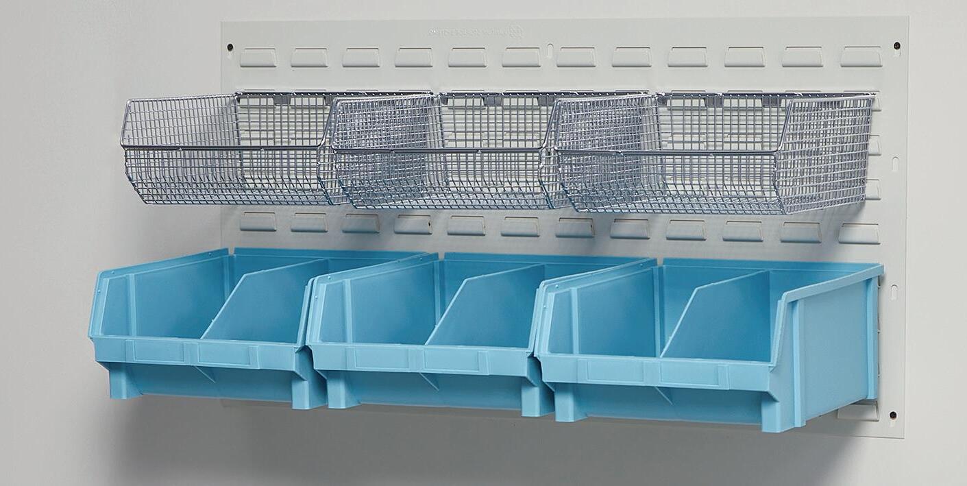 Adjustable Storage - HCL® Bin Hanging System (18720) includes 3 hanging rails that can be adjusted in different slots on the panel to accommodate bins.