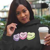 The Detroit-themed candy hearts black hoodies in white, pink and black, featuring the captions “Motor Sweetie”, “Dequindre Cutie” and “D-riffic,” are perfect for Valentine’s Day and Detroit lovers. The design features colorful candy hearts with the captions.