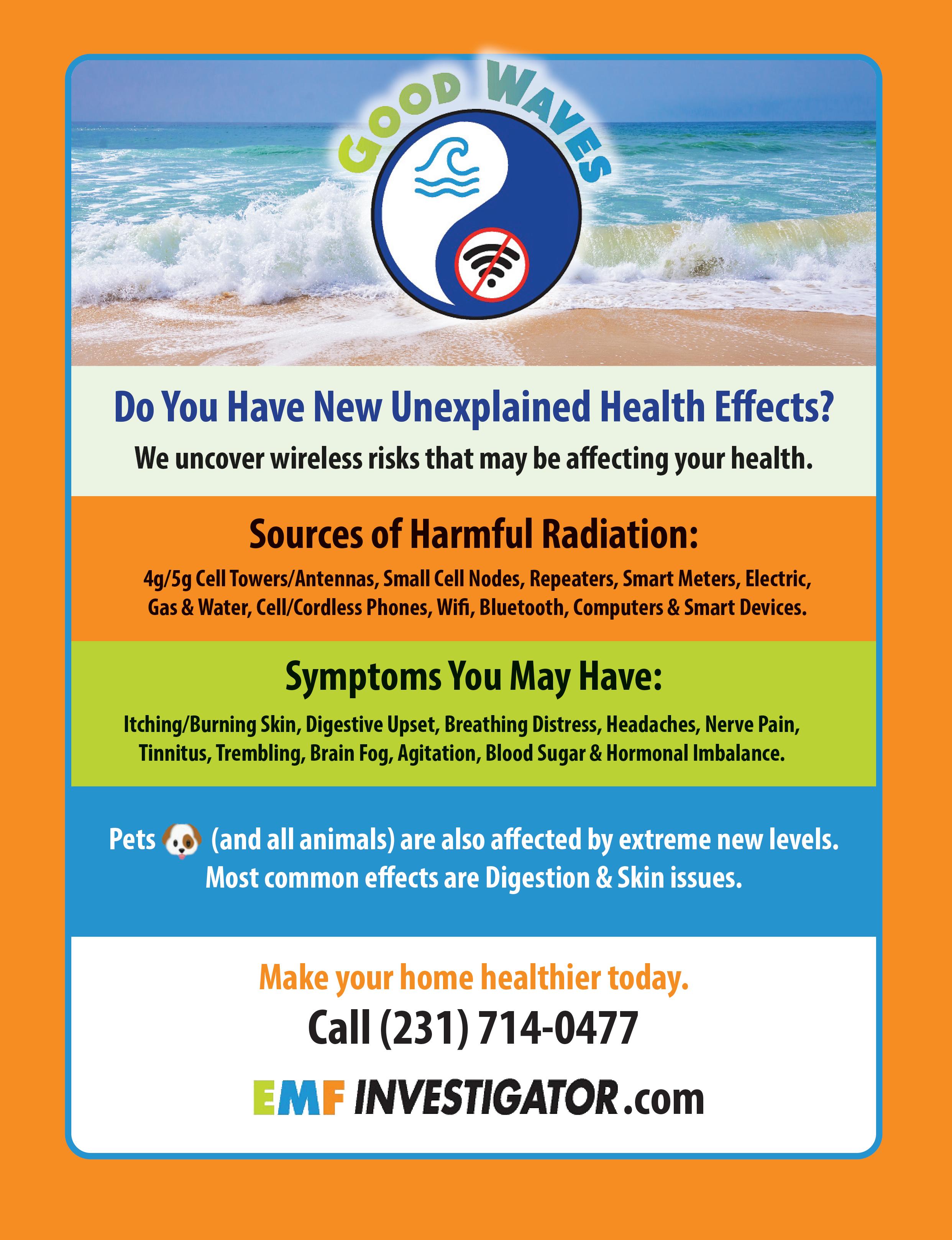 Many unexplained health issues are showing links to Cell Phones/Towers/Wi-Fi (with levels now stronger than bodies naturally adapt to). We detect EMF-related causes by determining sources of harmful radiation & offer solutions to mitigate them. See ad on back cover.