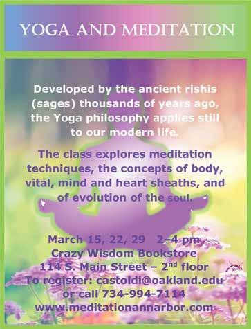 This event is offered free of charge. Registration is required to attend. Location: 114 S. Main St., Ann Arbor. For more information or to register, call 734-994-7114 or visit MeditationAnnArbor.com. See ad page 23.