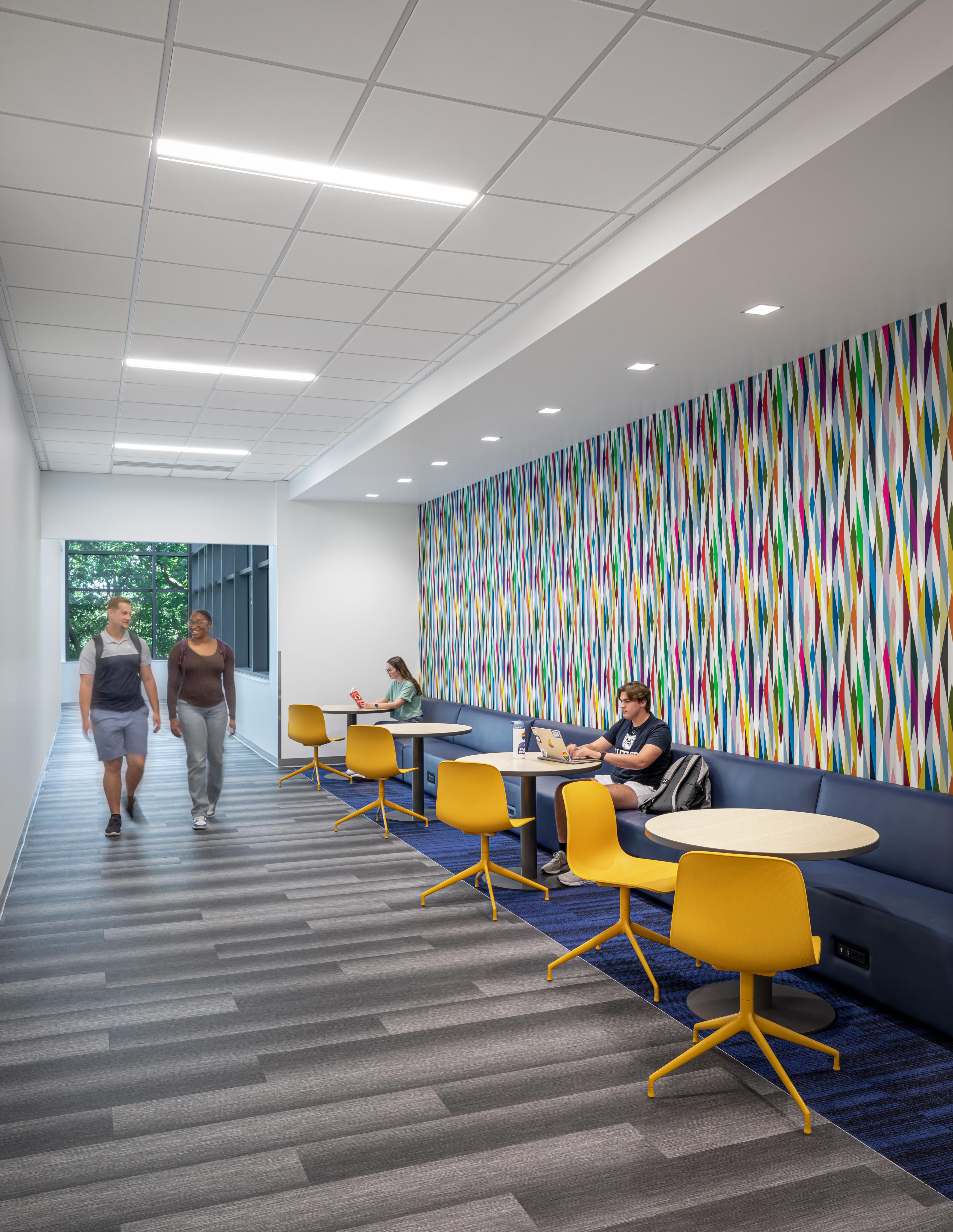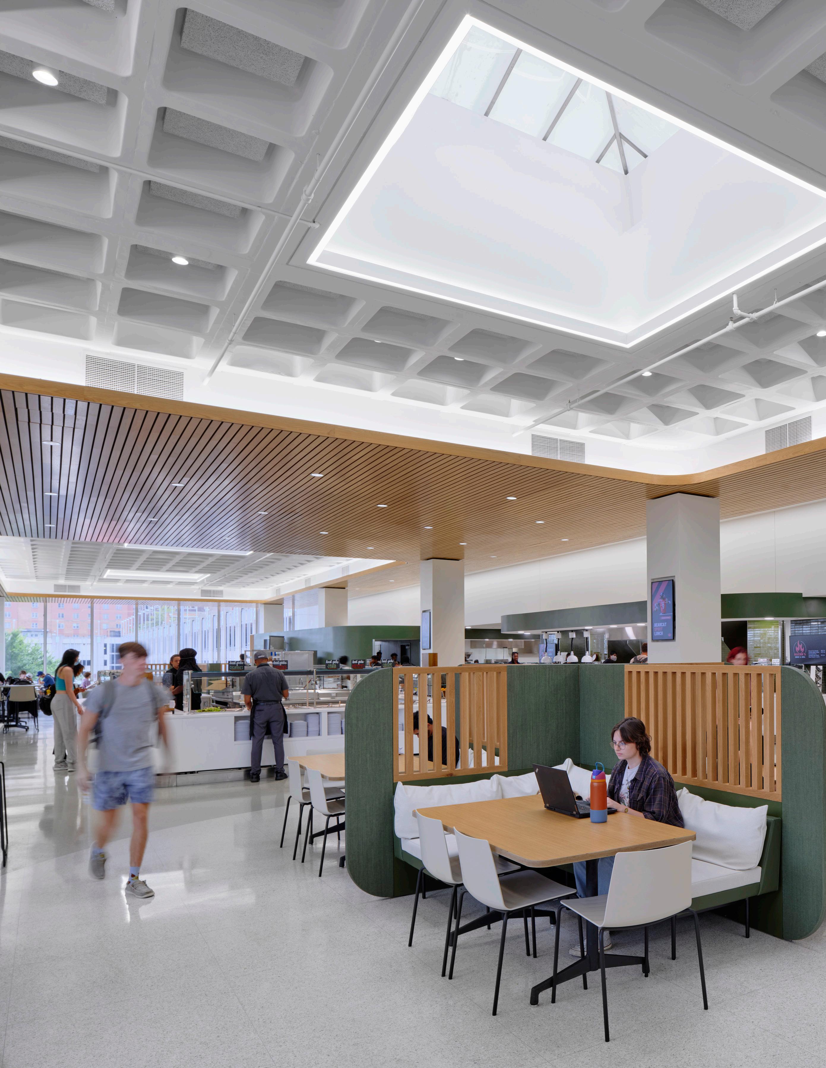 Designed with students in mind, the space offers room for group gatherings, as well as plenty of options for individual dining. The reimagined space creates an immersive environment with upgraded sound system, LCD screens, and digital menu boards.