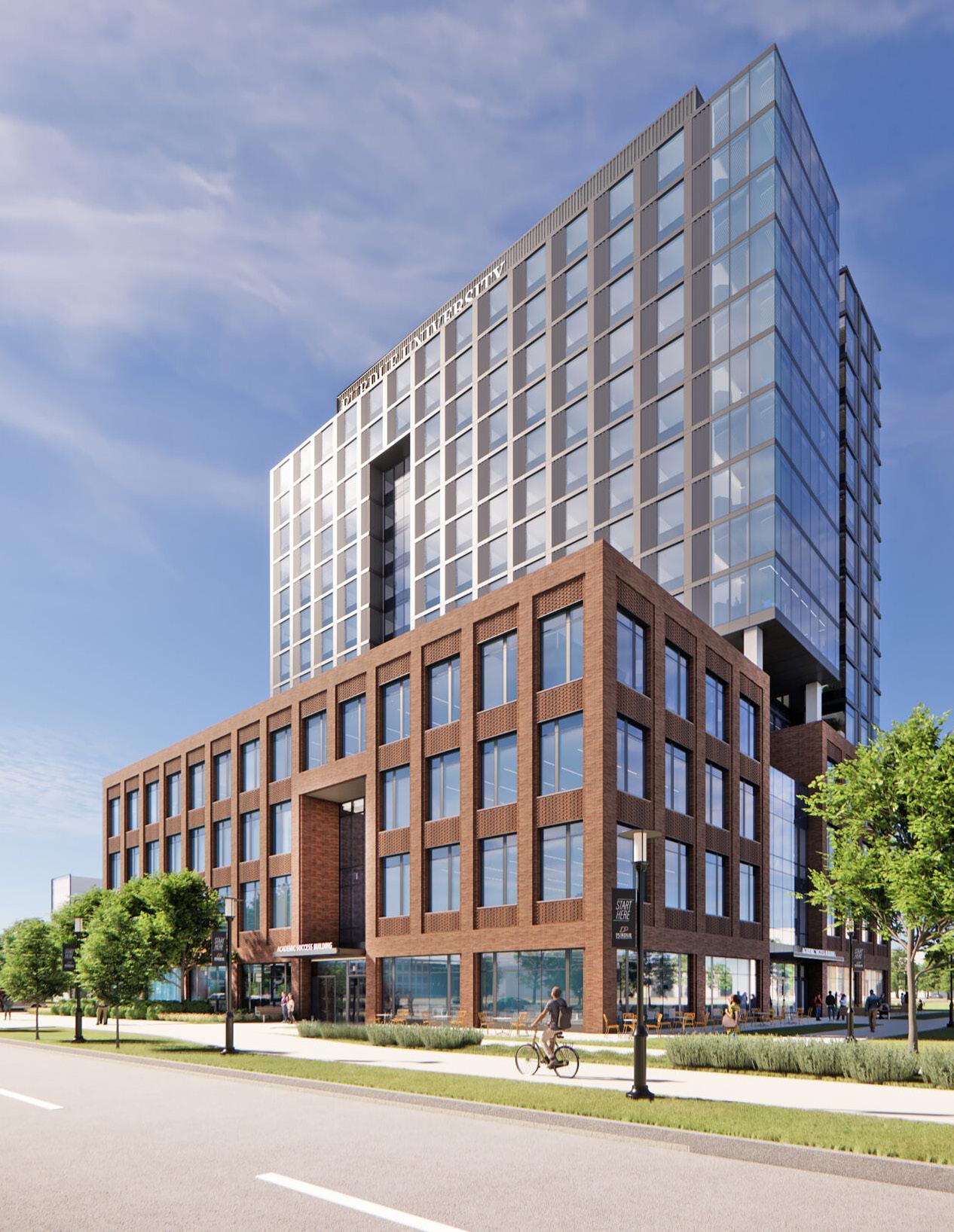 It will provide four levels of academic space with classrooms, chemistry labs, maker spaces, and retail offerings, alongside 11 residential levels accommodating up to 500 students. Plans also include a DINING AREA WITH UP TO 400 SEATS and a large gathering space for community and student engagement.