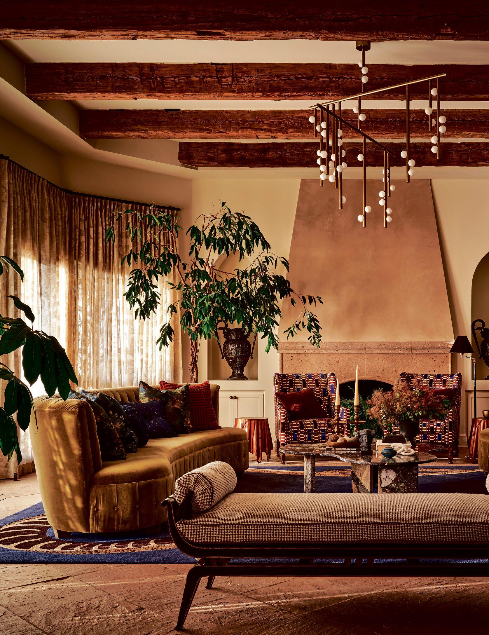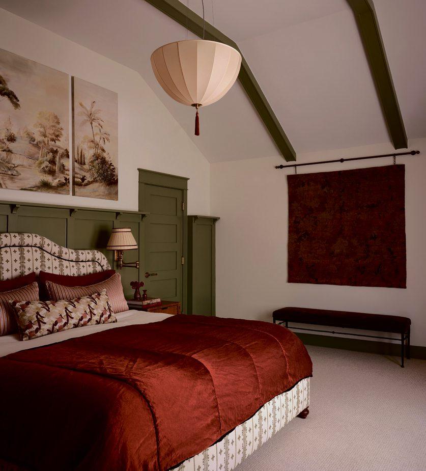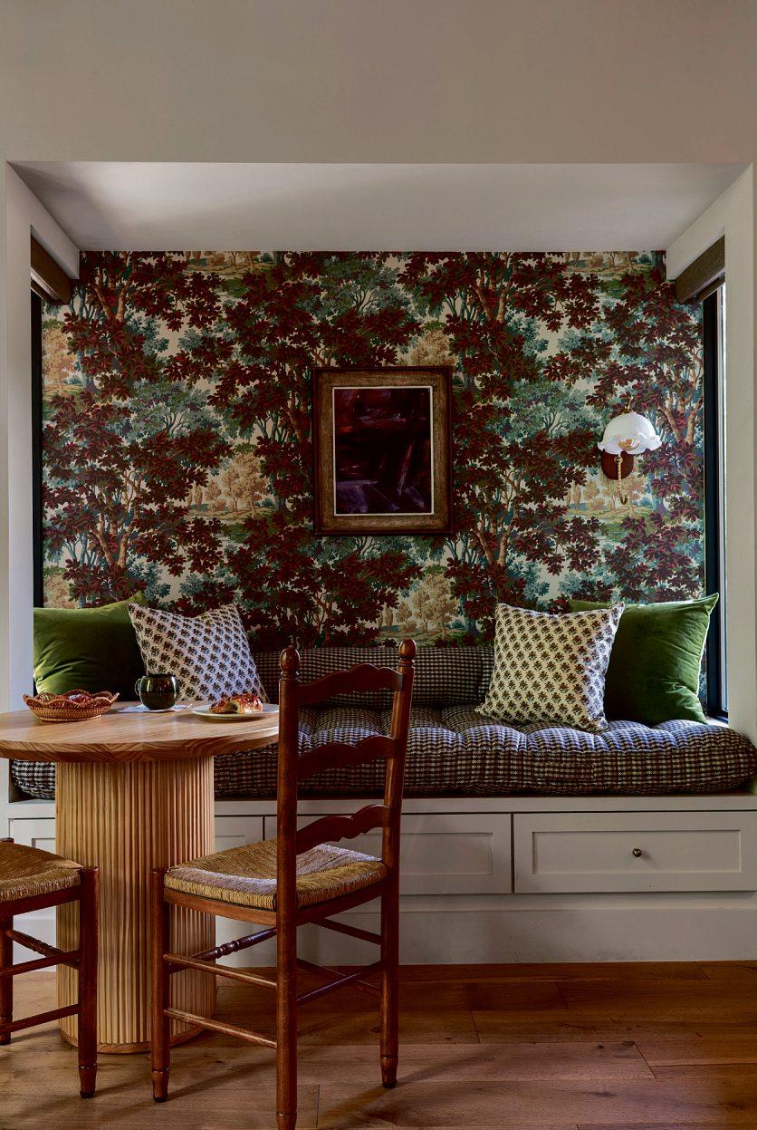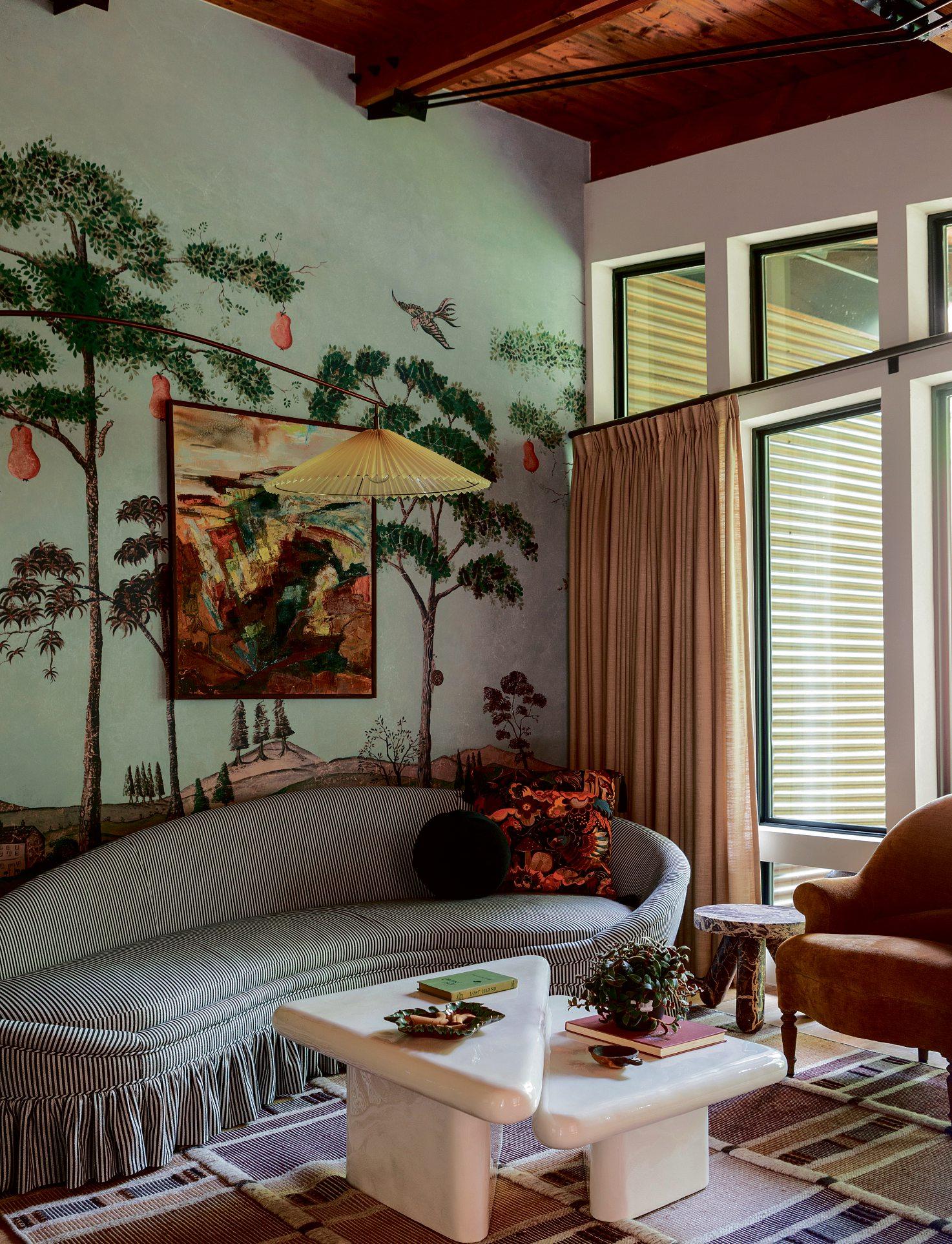 Throughout thehouse,spacesmoveeasilybetween tailored andrelaxed.Salvagedbarnbeams ground thediningroom, whileinformallivingareas overflow with plants,vintage furniture, andpattern.The primarysuite leansintoromance—hand-painted wallpaper, Fortunytextiles, alacquered ceiling— balanced by deeply practicalchoices elsewhere, from terrazzo bathstoa saunatuckeddiscreetlybeyond thecloset.