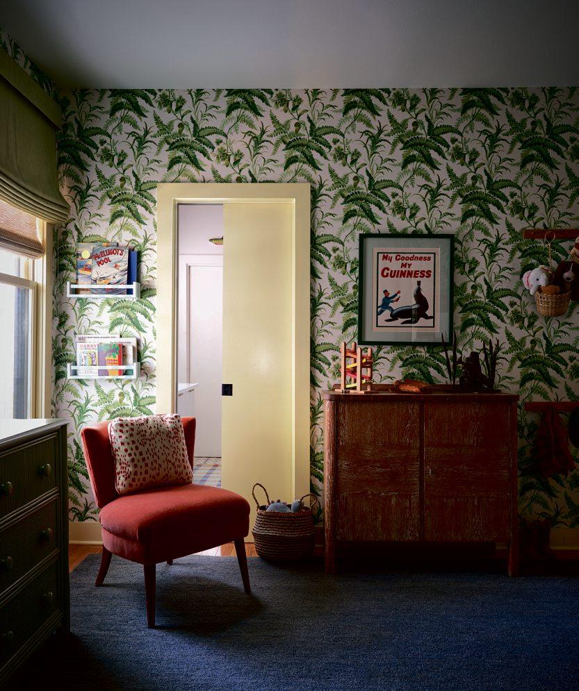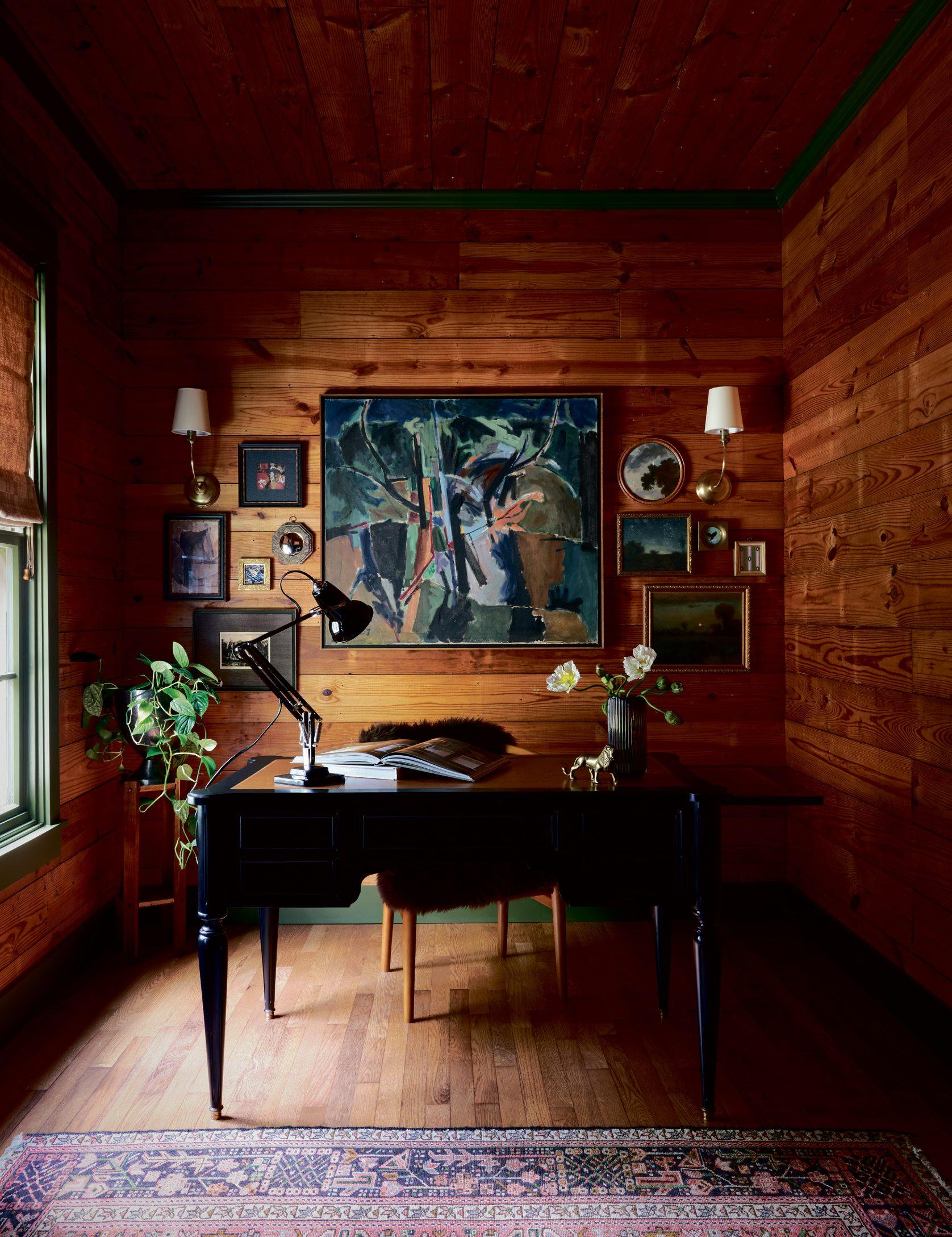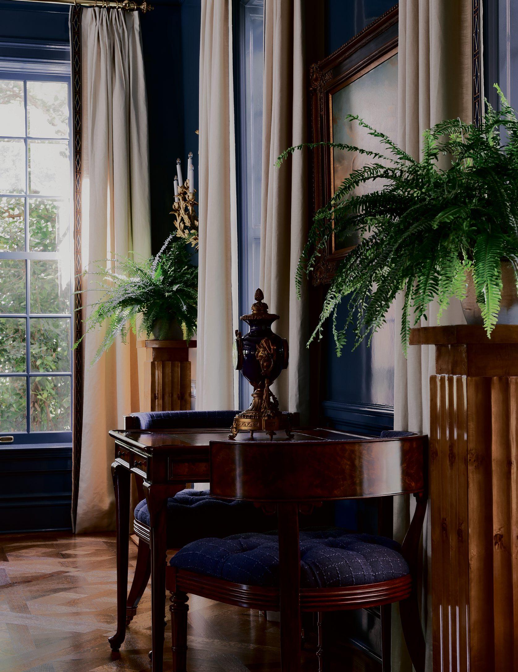 Throughout thehouse,spacesmoveeasilybetween tailored andrelaxed.Salvagedbarnbeams ground thediningroom, whileinformallivingareas overflow with plants,vintage furniture, andpattern.The primarysuite leansintoromance—hand-painted wallpaper, Fortunytextiles, alacquered ceiling— balanced by deeply practicalchoices elsewhere, from terrazzo bathstoa saunatuckeddiscreetlybeyond thecloset.