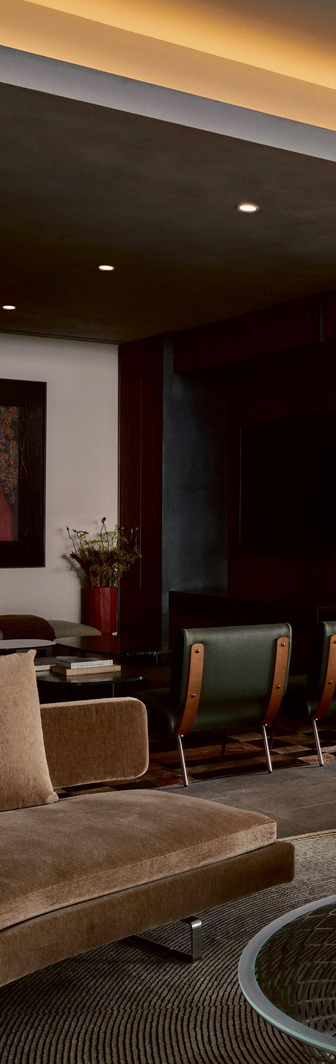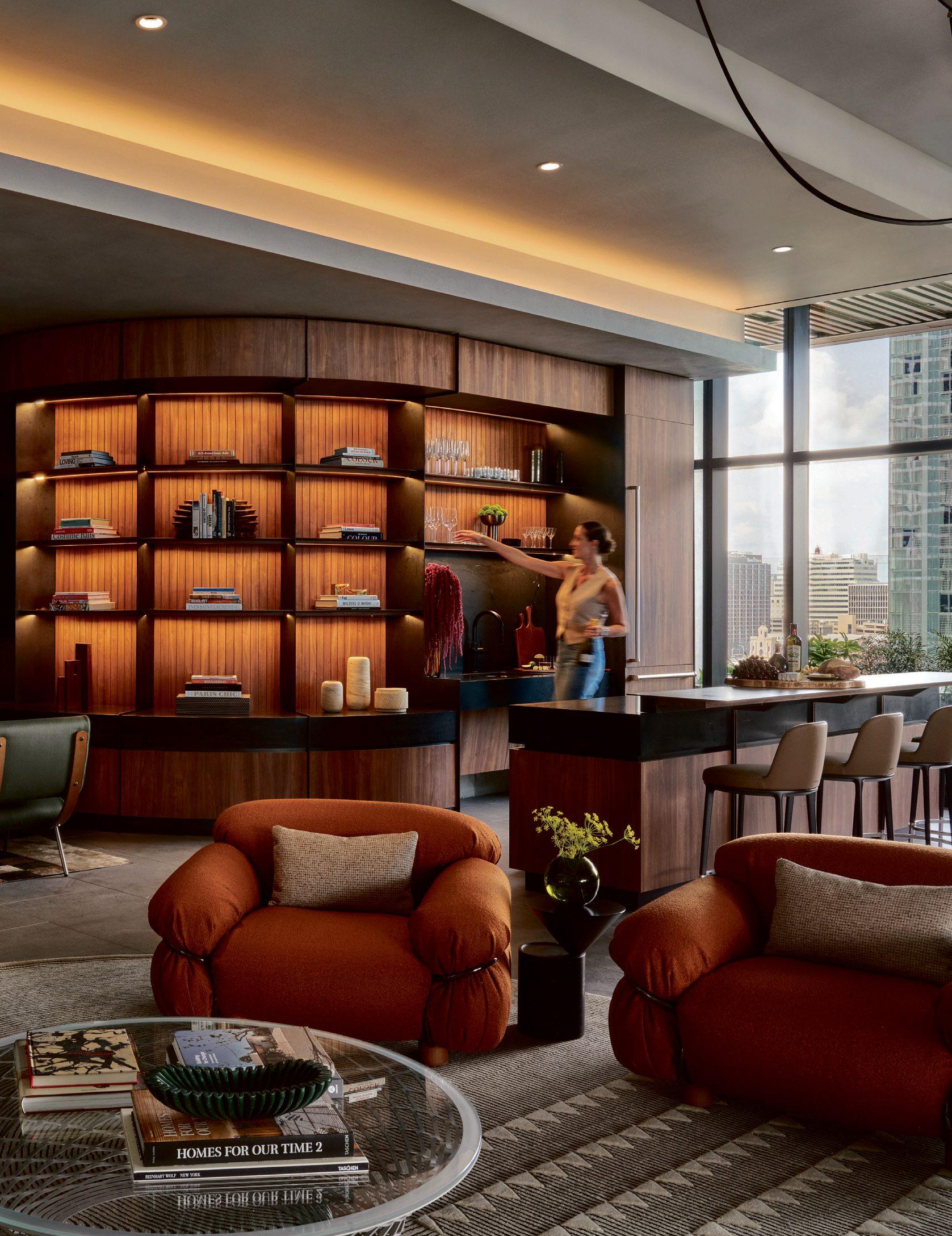 Whilethe tower’ssleek glassformand arched concrete entry make adramatic firstimpression, it’s thecommunalspaces designed by Urbanspace Design Studio that define daily lifeinside. Thelobby unfoldsas asequenceofhospitalitydriven moments: soaringvolumes,a sculptural wovenscreen wall that glowslikea lantern, andlayered textures of wood, stone, andart that strike acareful balancebetween drama andwarmth. Resident loungesemphasize curved millwork, sculptural furniture, andintimatelightingoverornament, creating spaces that feel both elevated andrelaxed