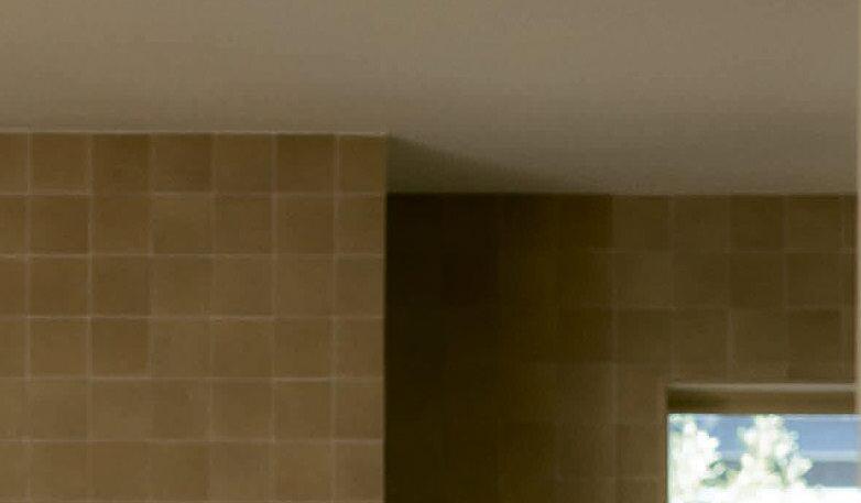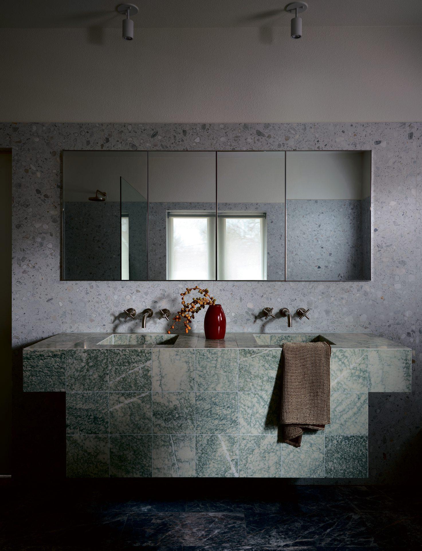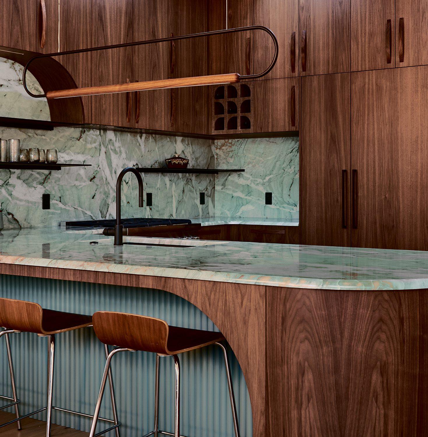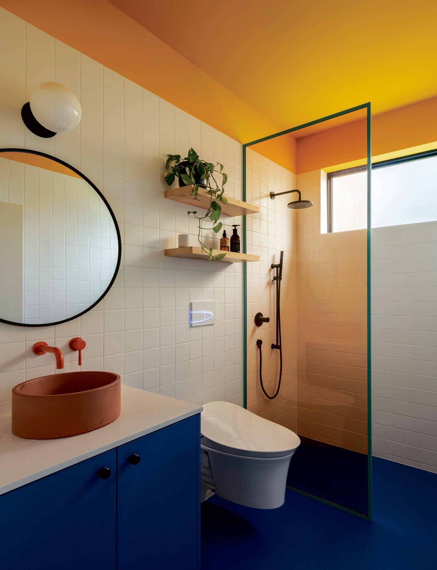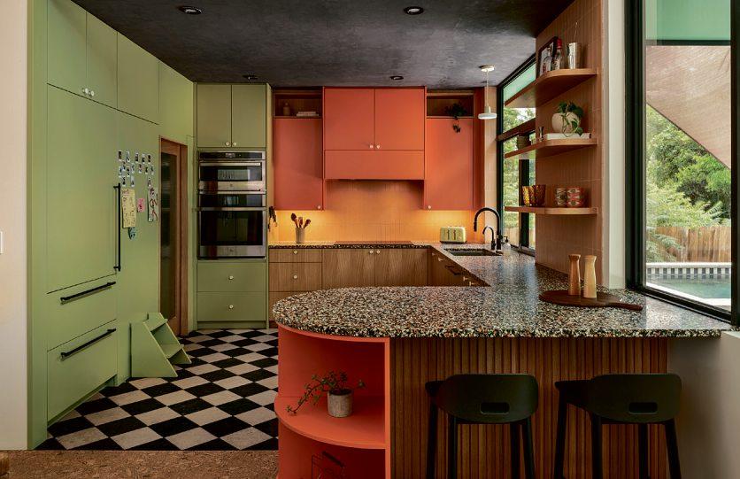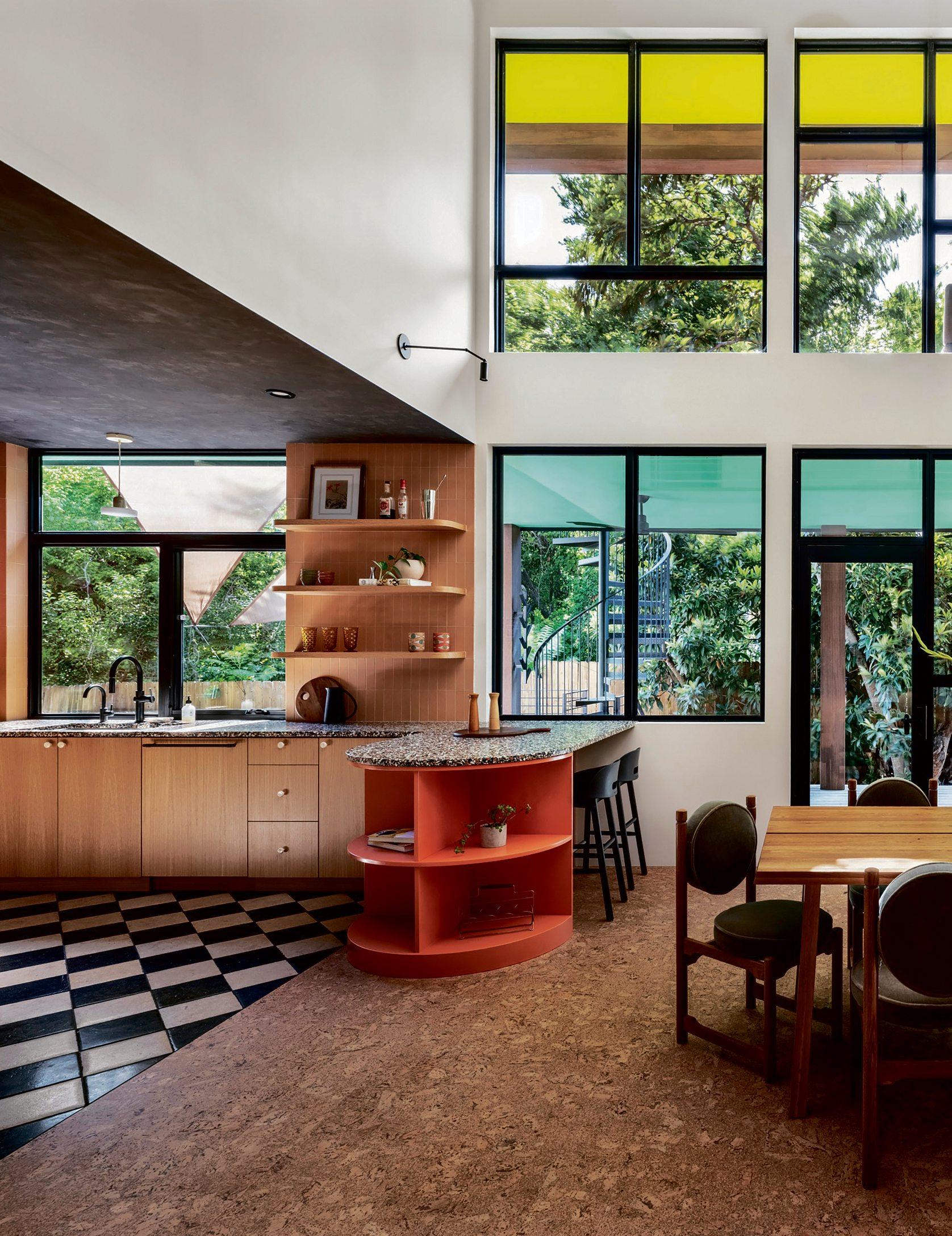 Thekitchen anchorsthe home’s narrative. Punchy salmon cabinetrymeets soft bamboo green, grounded by dark terrazzo counters andwarmwhite oakmillwork. Ablack-and-cream checkeredlimestone floormarks thetransitionintothe adjacent dining area—a playfulnod to thehome’sstorybook sensibility. Elsewhere, colorcontinues to shapeexperience: adownstairsbathpairs agolden-yellow ceilingwitha sealed blue concrete floor, delivering an immersive, high-contrast moment rooted in primarytones