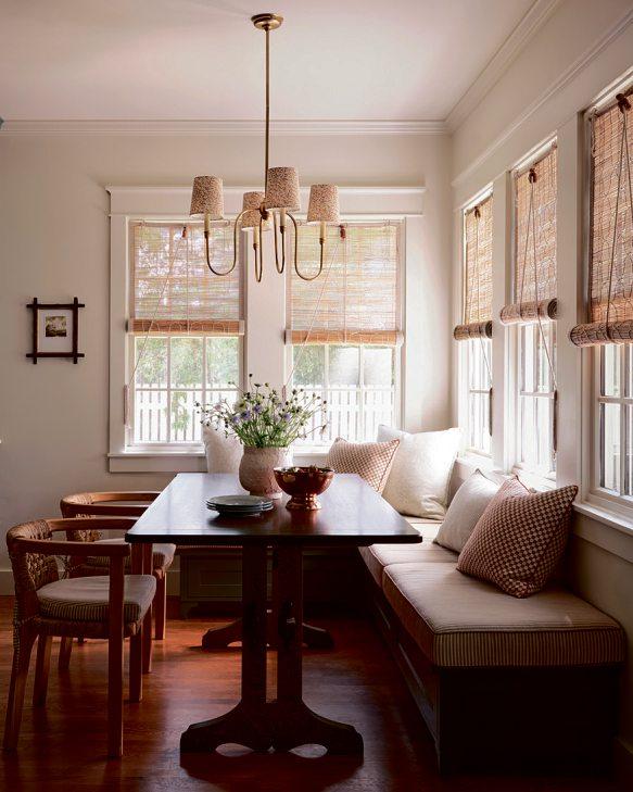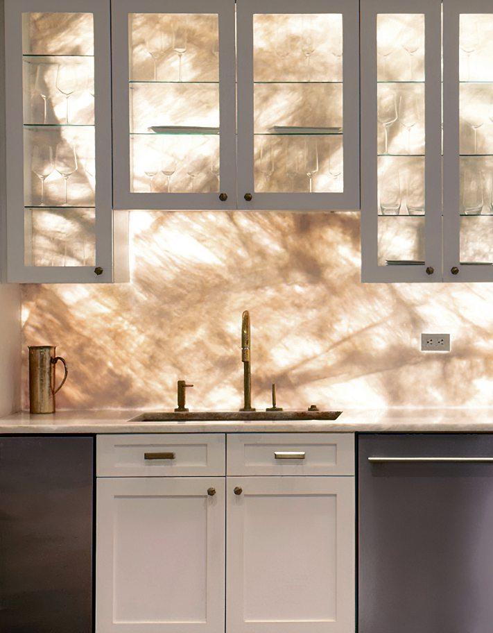 Material choiceswereguidedbylongevity as much as beauty.Soapstone countertopswithintegralsinks, terrazzo tile,reclaimed longleaf pine,salvagedbrick, custom brassfaucets,and leatherdrawerpulls create atactile,timelessinteriormeant to weatheranother centuryofuse.Daylightwas carefullythreaded throughout,withrestoredtransoms, newhigh windows, skylights, andevena vintagebottle-glass window that diffuses lightbetween rooms.
