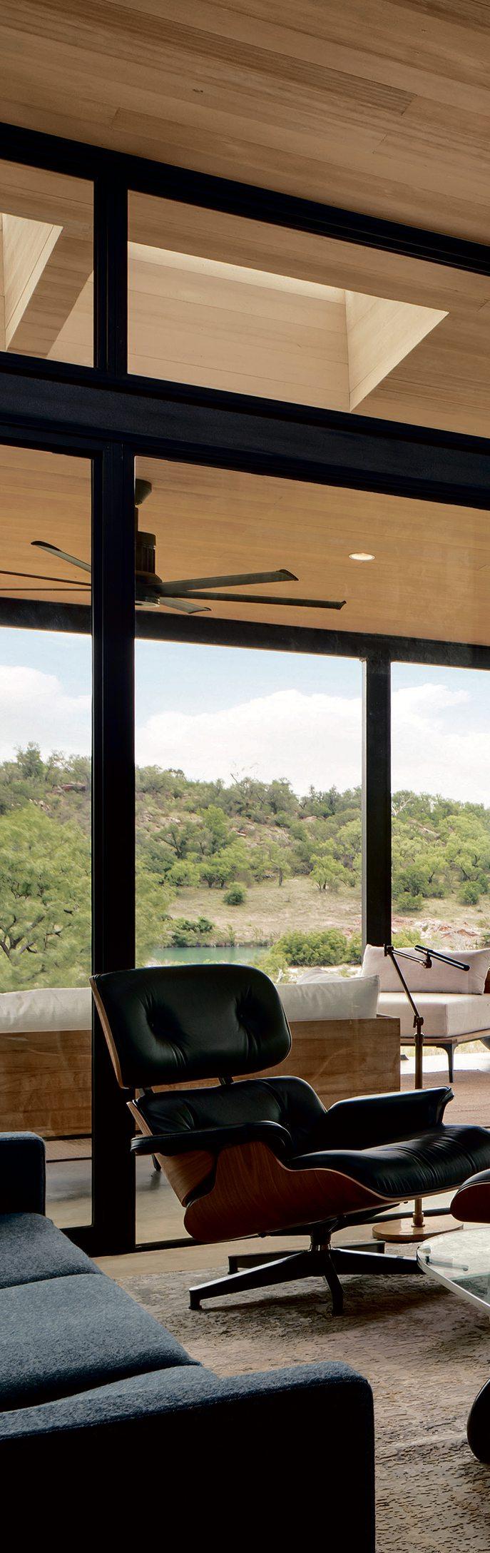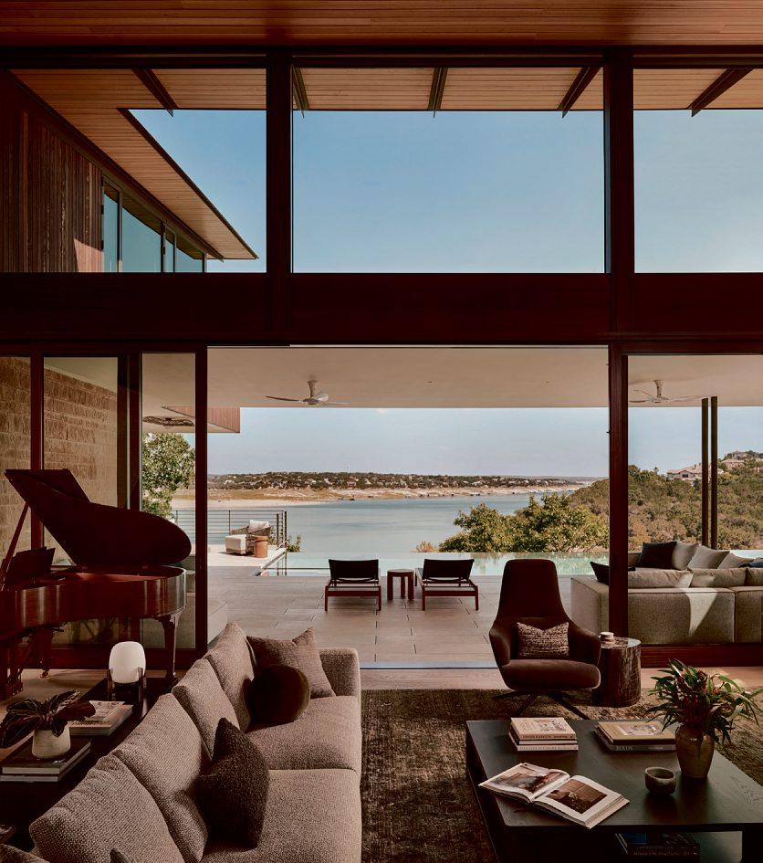 Perched on a rugged bluff above Lake Travis, Overlook House feels carved into the landscape rather than placed upon it Designed by A Parallel Architecture, the multi-level home is anchored by site walls that merge directly into the cliff face, grounding the structure before it opens outward to sweeping lake views Dramatic rooflines stretch wide, framing the horizon while pulling daylight and breezes deep into the interior