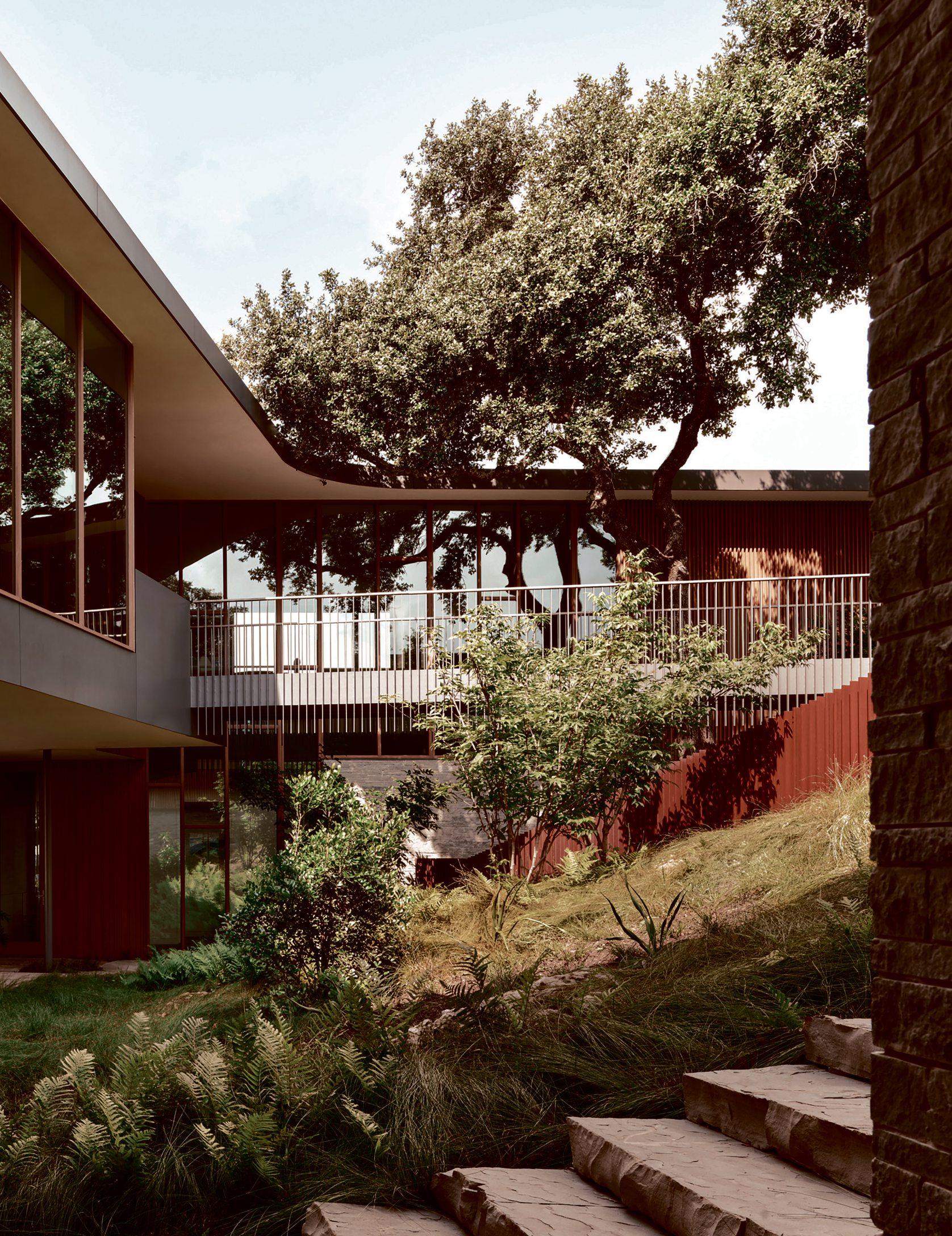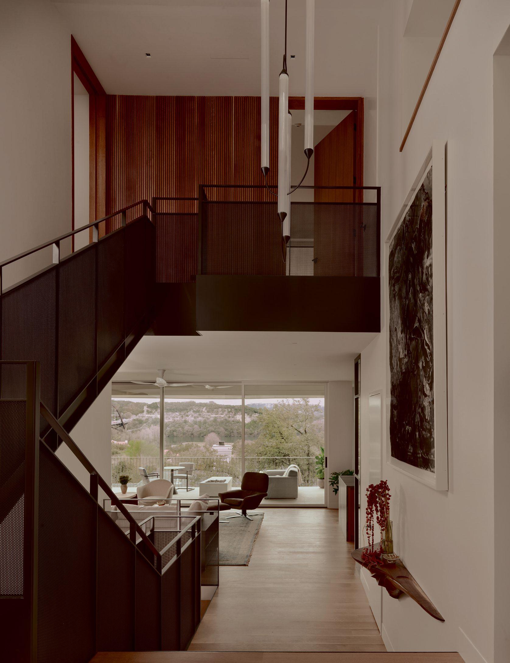 Designed by AlterstudioArchitecture, thehouse is carefully choreographedarounda sequence of framed views. Arrival is cinematic: abridgethreads throughmatureoaks, offering glimpses of what lies aheadbeforeopening into aU-shaped plan that wrapsdiningand living spaces around aprivate court. Floor-to-ceilingglazing pullsin sweepingvistasof westernAustinand thePennybacker Bridge,while moments of enclosure—thickmasonry walls,warmwoodceilings,and shaded outdoorrooms—offer pauseand intimacy
