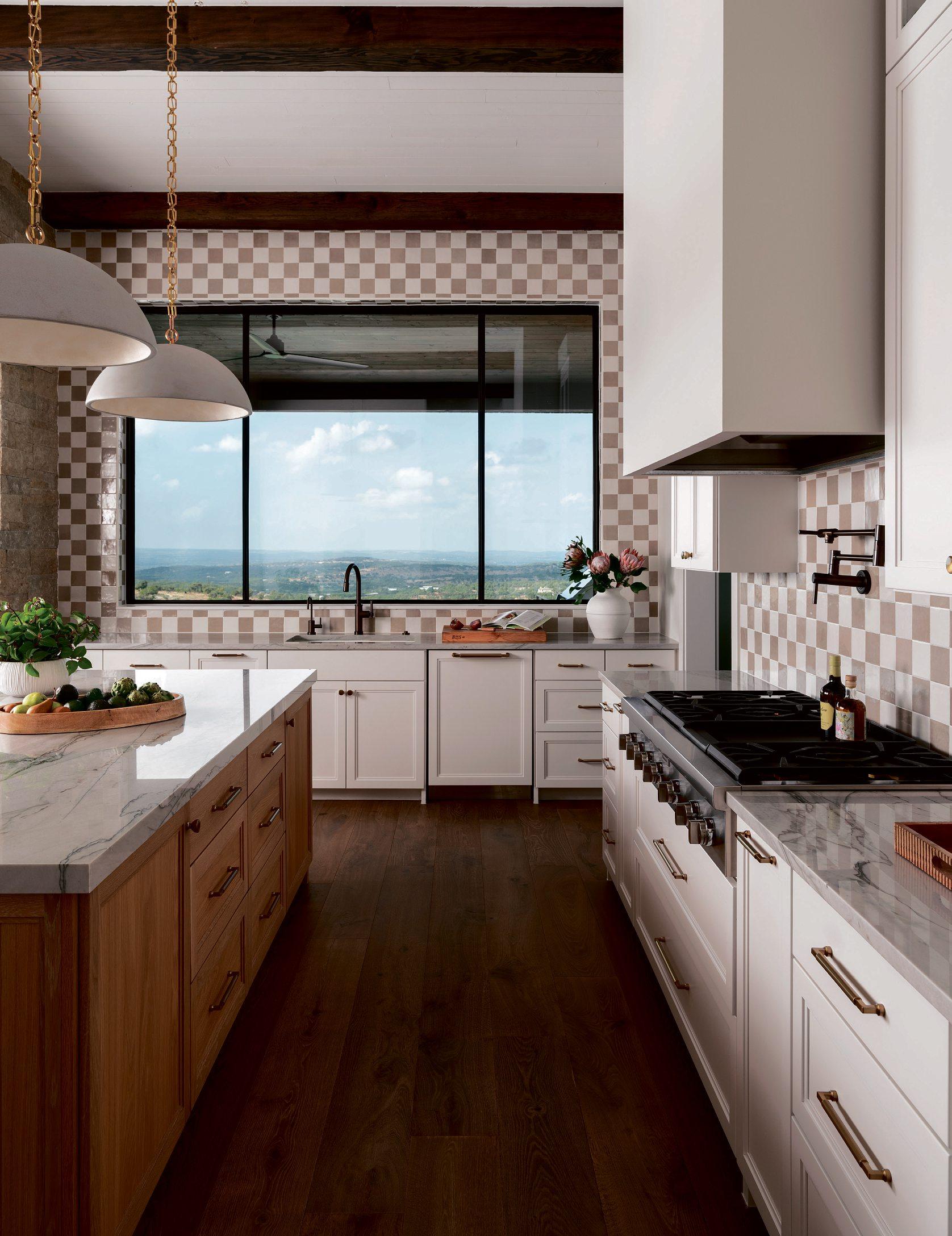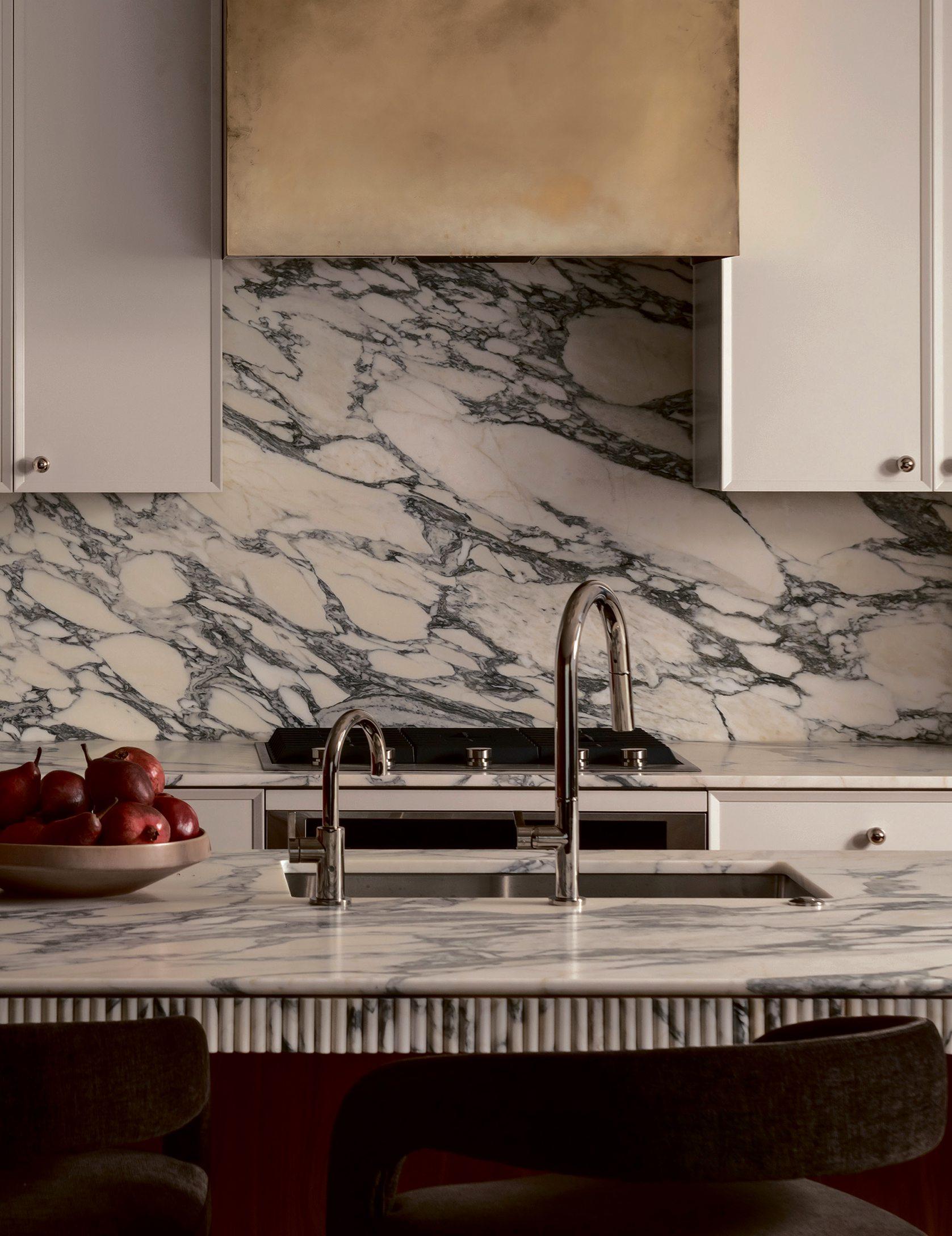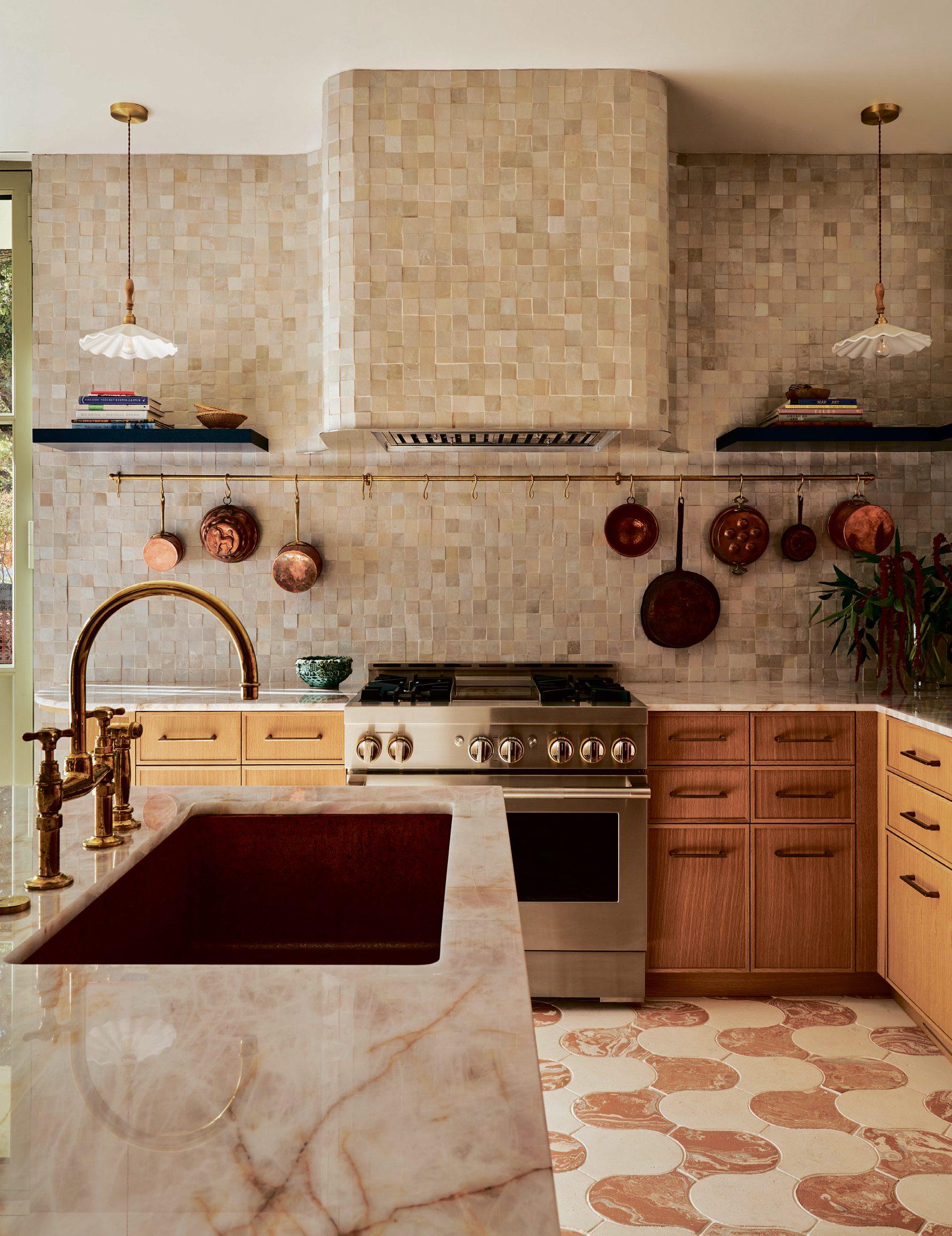 That sensibilitymirrors Stacey’s ownapproach. Influenced earlybyantique auctions anda childhood spentabsorbing theeclecticvisuallanguageof Louisiana, she’sknown forplayful layering and fearless combinationsthatfeelbothtimeless andfresh Here,the kitchenbecamea turningpoint:originally imagined in white, it shiftedtoa creamy yellow better suited to thewestern light, anchored by aLaCornue range,boldmarble,acopper-toppedDeVolworkbench, anda custom hood with brassstraps.