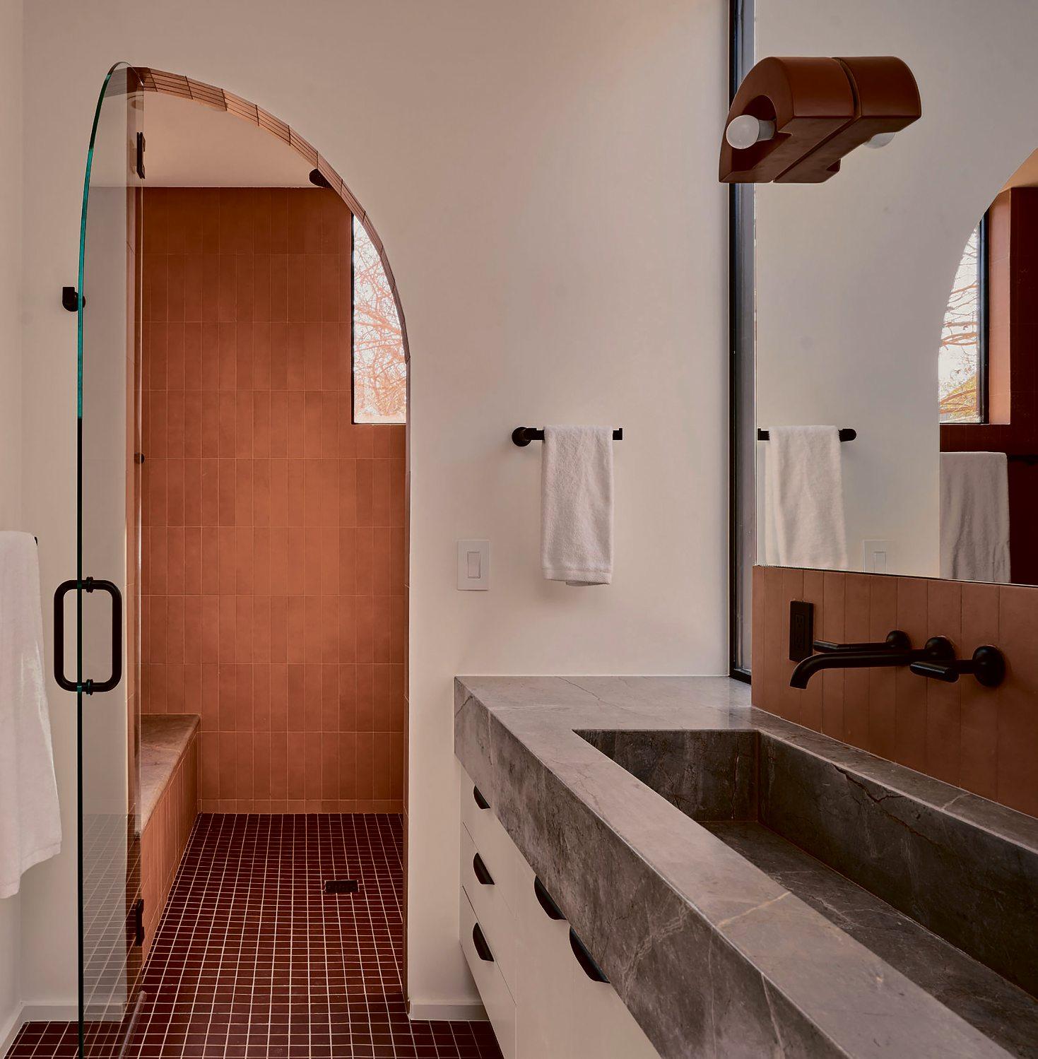 Material choicesreinforce theconnectiontoplace.Native stone, weatheredsteel,and warm wood tonesechothe surroundingterrain,while interiorsremaincalmand tactile, designed to support an eclectic collection of regional artand furniture. Acustomlive-edge mesquite vanity by family friend andartisan LouQuallenberg adds apersonal, handmade note