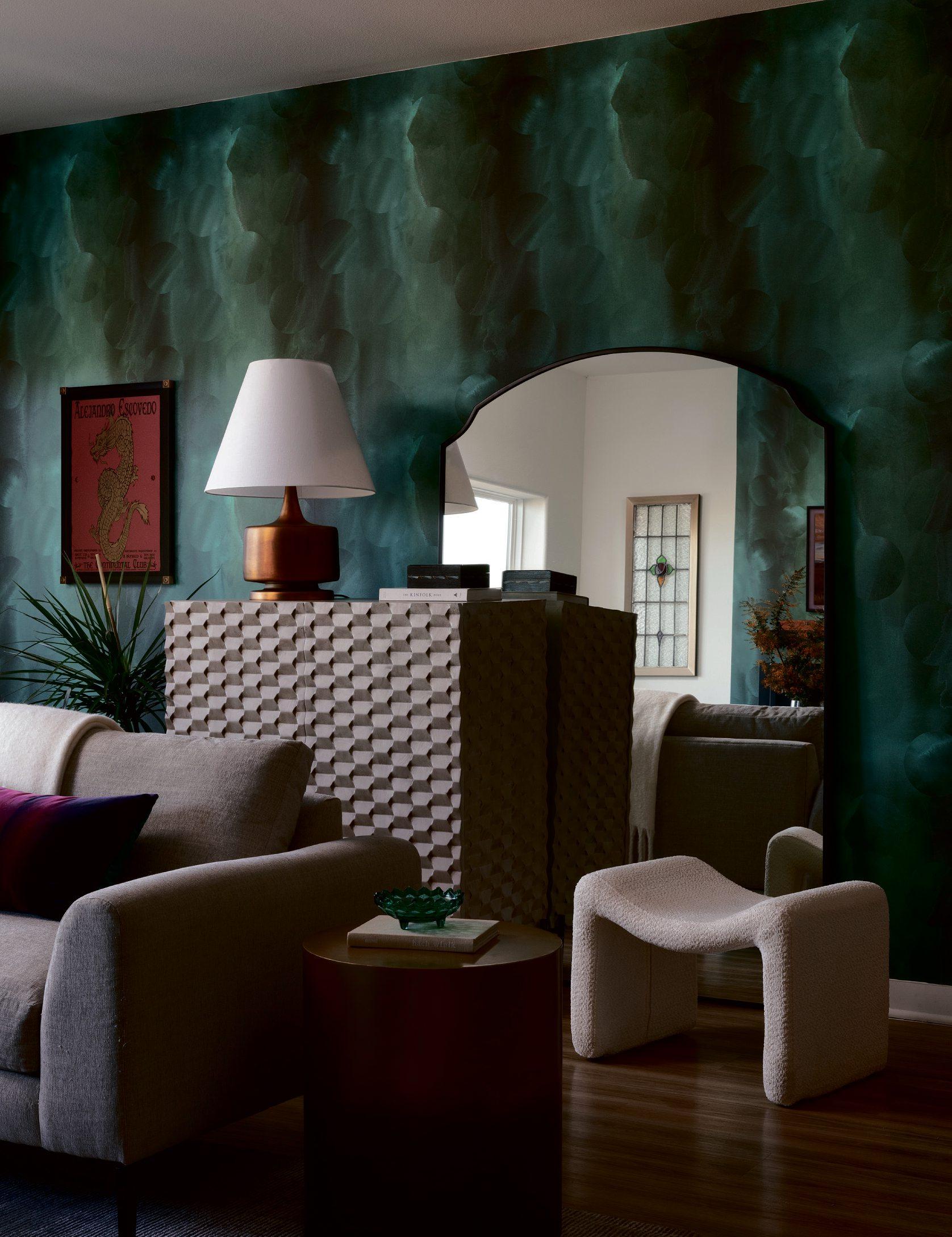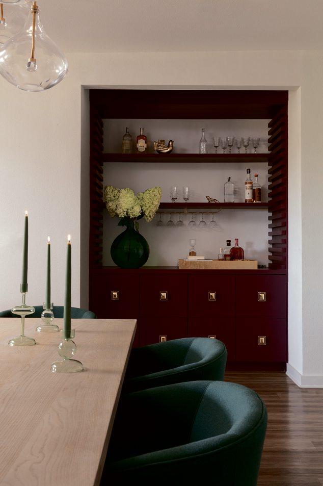 Blueberry JonesDesigntransformed ablank-slate SoCo condointoa jewel-toned, personalityforwardretreat whereevery room tellsits ownstory.Openshelvingand bold wallpaper bringcharacter to thekitchen,while aformercoatclosetnow conceals amoody custom bar. In thelivingroom, anew fireplace, layeredtextures, andstatement patterns create a glamorousfocal point. Theprimary bedroom leanswhimsical andsoft, andthe secondary room flexes effortlesslybetween office andguest spacethankstoa built-inMurphybed Theresultisa highly curated, stylishlyfunctionalhomethatbalanceseverydayeasewith expressive flair.