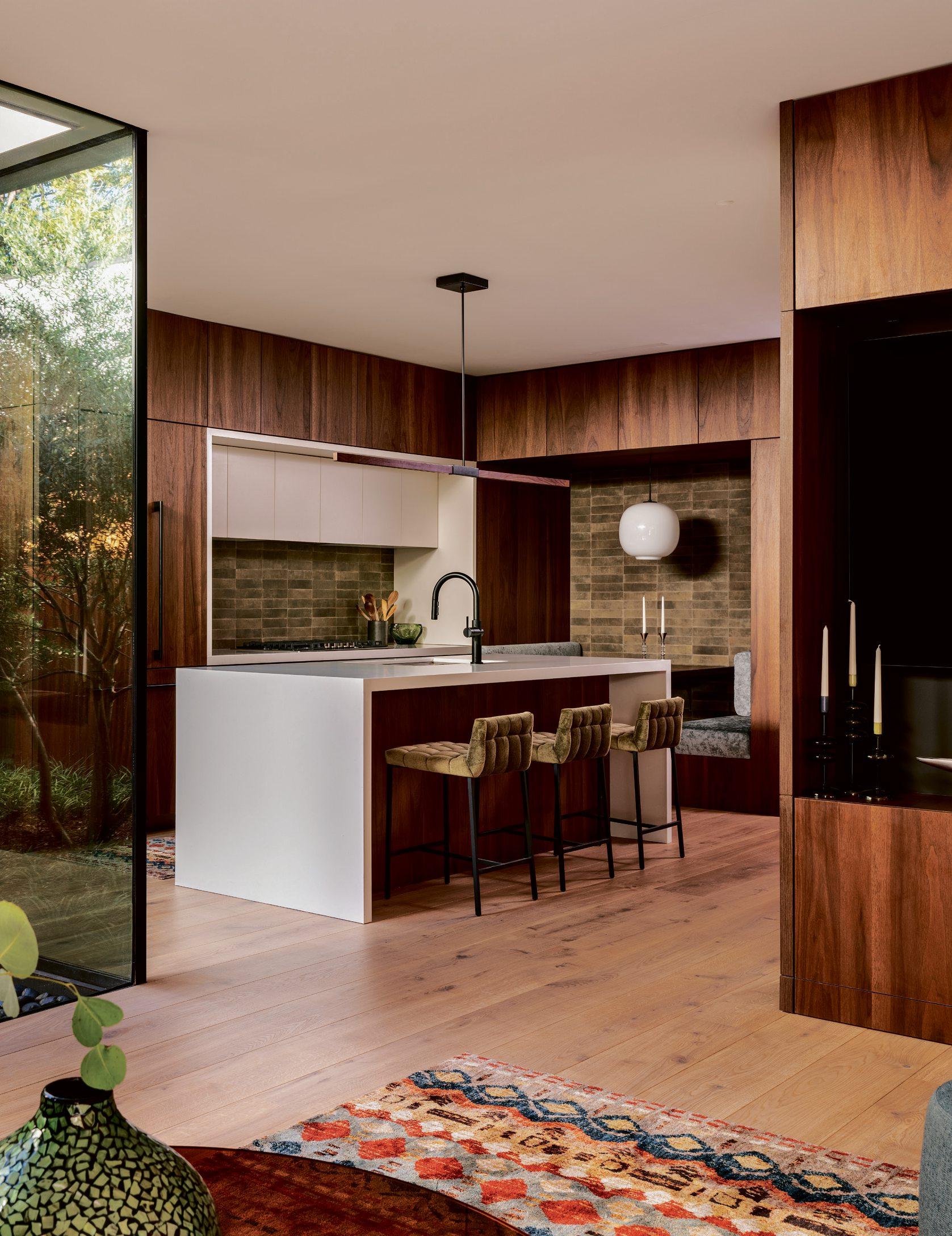 Rift-and quarter-sawn whiteoak floors,painted steel, andcombedoak paneling create material continuity across levels.Onthe main floor, expansivesliders open fullytoviews of Lake Austin,while silver travertine, Narbonne limestone, andleathered quartziteanchorthe kitchenand living spaces.Eventhe former basement nowfeels intentionalasa bright,connected,and fullyintegratedspace