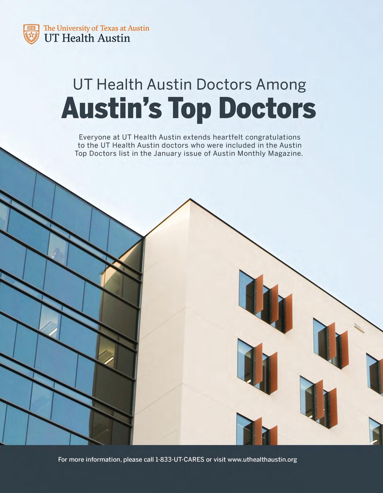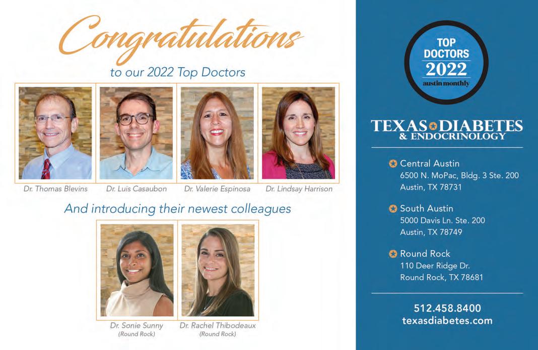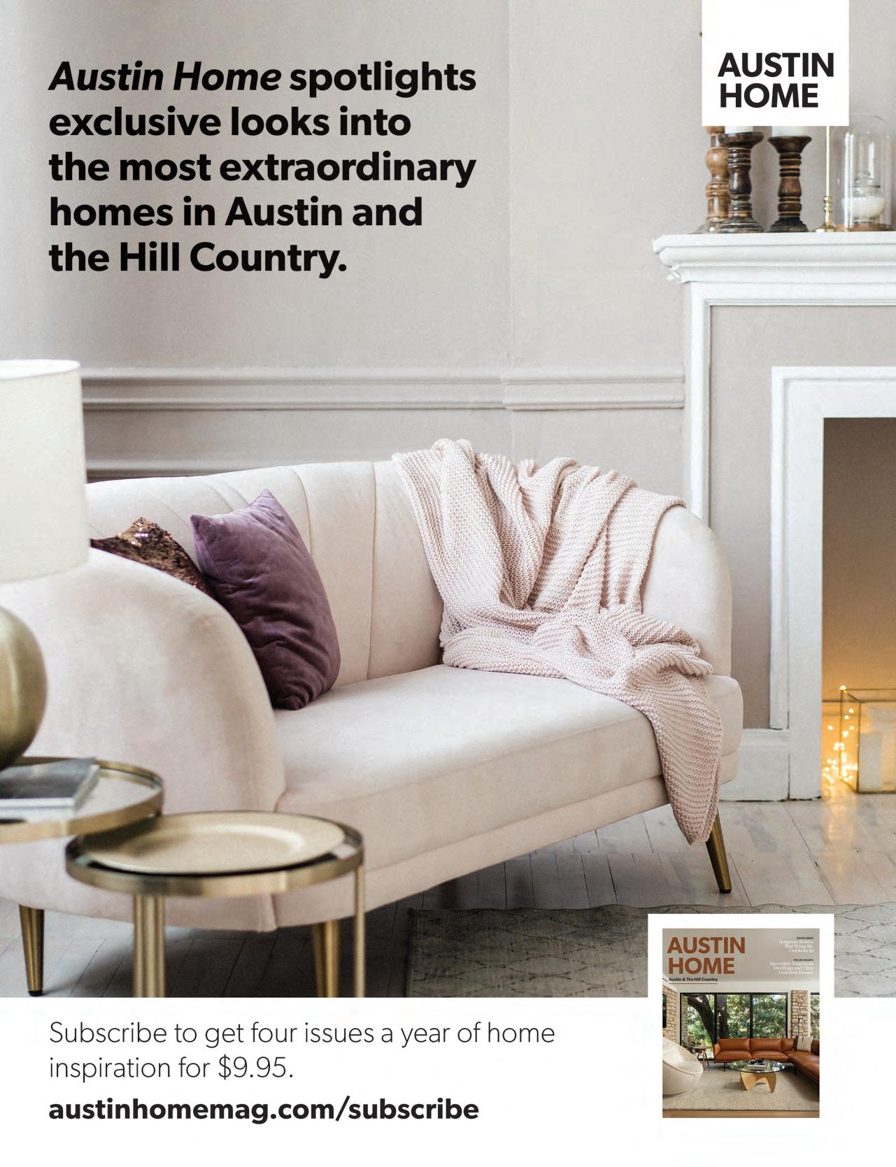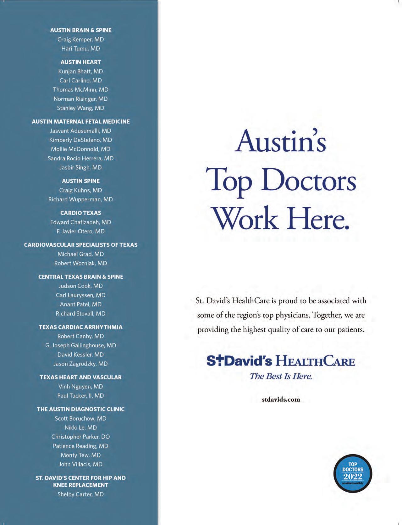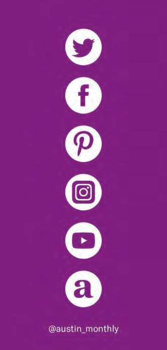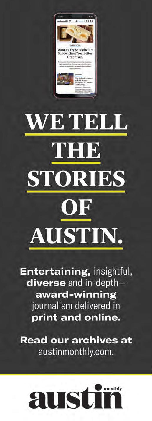 Austin Monthly uses best practices and exercises great care in assembling content for this list. It does not warrant that the data contained within the list are complete or accurate. Austin Monthly does not assume, and hereby disclaims, any liability to any person for any loss or damage caused by errors or omissions herein, whether such errors or omissions result from negligence, accident, or any other cause. All rights reserved. No commercial use of the information in this list may be made without written permission from Austin Monthly. If you see an error in the information listed, please contact info@ austinmonthly.com.