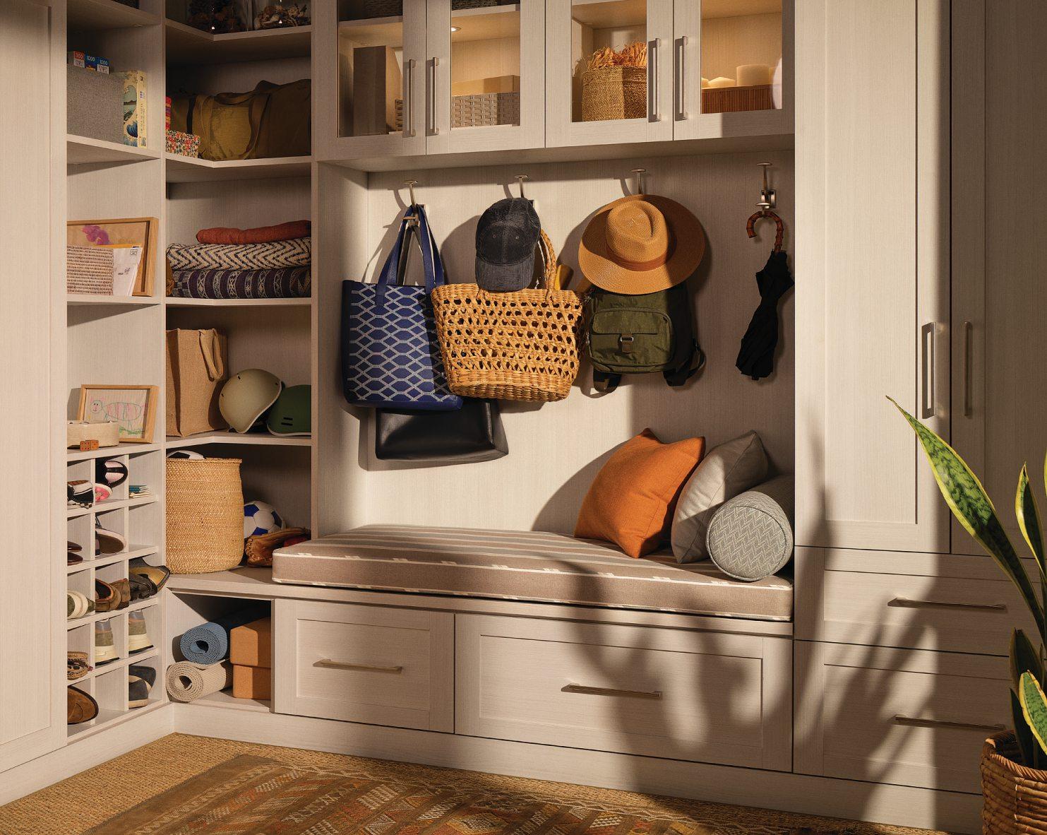 Banish clutter from the home by catching it at the door. An entry organizer with spaces for shoes, coats, backpacks, and shopping bags can be eye-catching and functional.
