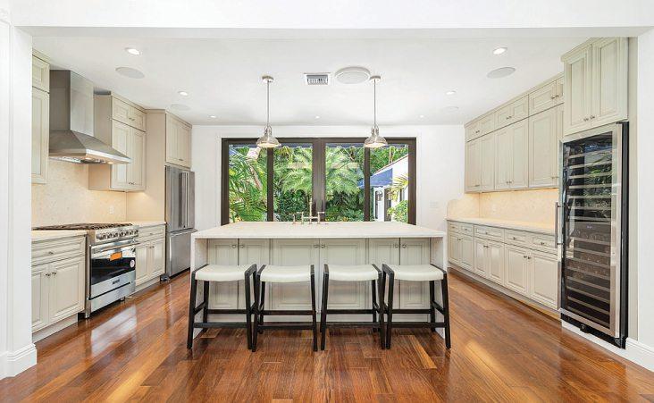 “The beautifulwhite cabinetry andquartzite counters areperfect forthe ‘beachy’ feel.Thereare plentyofpantrycabinetsand an abundanceofdrawers andstorage space. Ialsolovethe design detail of theglass cabinetry abovethe regularwood cabinet doors—so pretty when integrated lightingisswitched on.The antiquemirroreddoorsonthe twohugecabinetsconcealingthe appliancegarages arealsofabulous. It’s an incredibly pretty kitchen, with high-end finishes that arealsoverywelllaidout and functional,” Jonessuggested