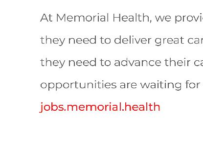 Memorial Health is a leading healthcare provider in central Illinois, offering career opportunities at every stage of your professional journey. With multiple facilities across the region, we offer a chance to work in a wide variety of care settings. There are also many ways to grow within our organization, with access to continuing education and advanced training opportunities.