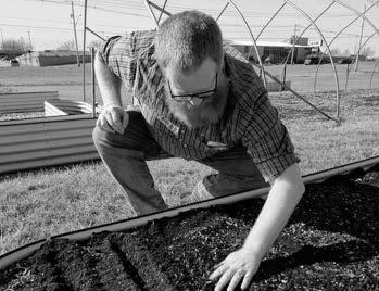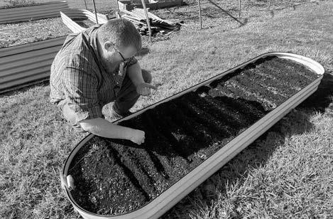 Ken Johnson, University of Illinois Extension's horticulture educator for Morgan, Calhoun, Cass, Greene and Scott counties, uses a stick to dig a shallow trench in a raised bed at Extension’s Lukeman Garden and Education Center along West Morton Avenue in Jacksonville. While he dug trenches the width of the container in one raised bed, he dug this one length-wise because he was preparing to plant peas that will need a trellis to grow, he said, noting longer rows make it easier to build such a trellis.
