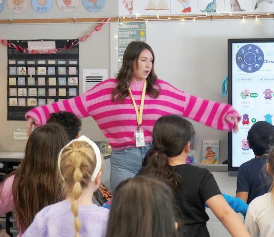 Stoney Creek rst-grade teacher Grace Olsson holds a pose as students use vocabulary words in a sentence.
