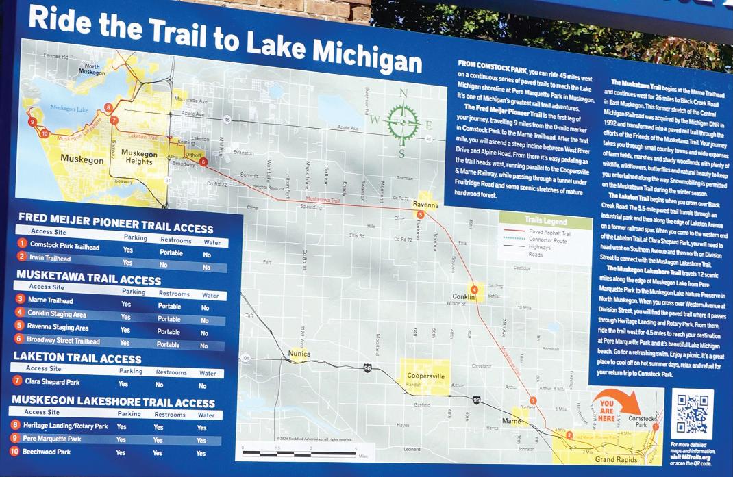 It is now possible to cycle from Comstock Park to Lake Michigan on paved trails, except for a small section in Muskegon. To reach Lake Michigan trail users travel from the White Pine Trail in Comstock Park to the Fred Meijer Pioneer Trail, the Musketawa Trail, and the Laketon and Lakeshore trails in Muskegon. The route is depicted on one of three signs installed in a kiosk.