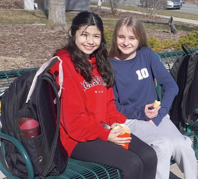 Mill Creek Middle School seventh graders Mar Esparza and Claire Bolek take an after-school break March 2 at the Comstock Park Community Plaza.