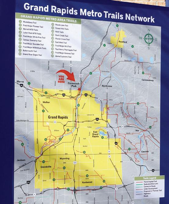 A map shows how the White Pine Trail in Comstock Park connects to the Grand Rapids area trail network via North Park Bridge and Riverside Park.