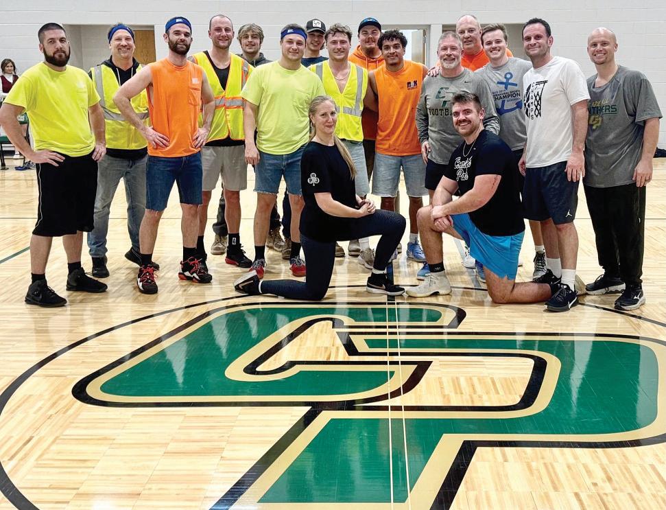 The construction team and some high school sta celebrated the opening of the auxiliary gym with a basketball scrimmage.
