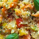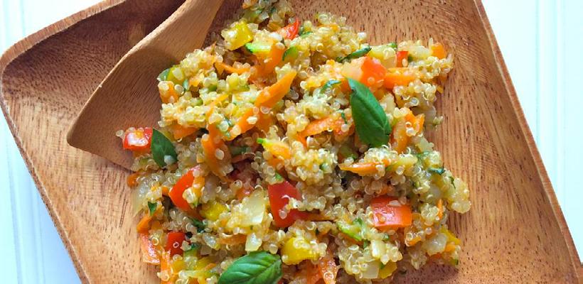 4. Stir in carrot, zucchini, red and yellow peppers and cook for 5 minutes or until tender crisp. Add pepper. Stir into quinoa mixture with basil.