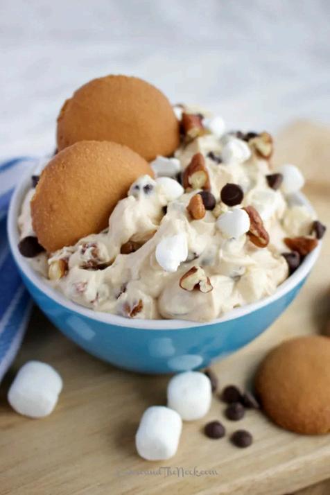 3.Fold in mini marshmallows, mini chocolate chips and pecans.