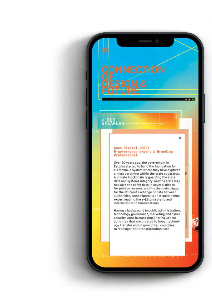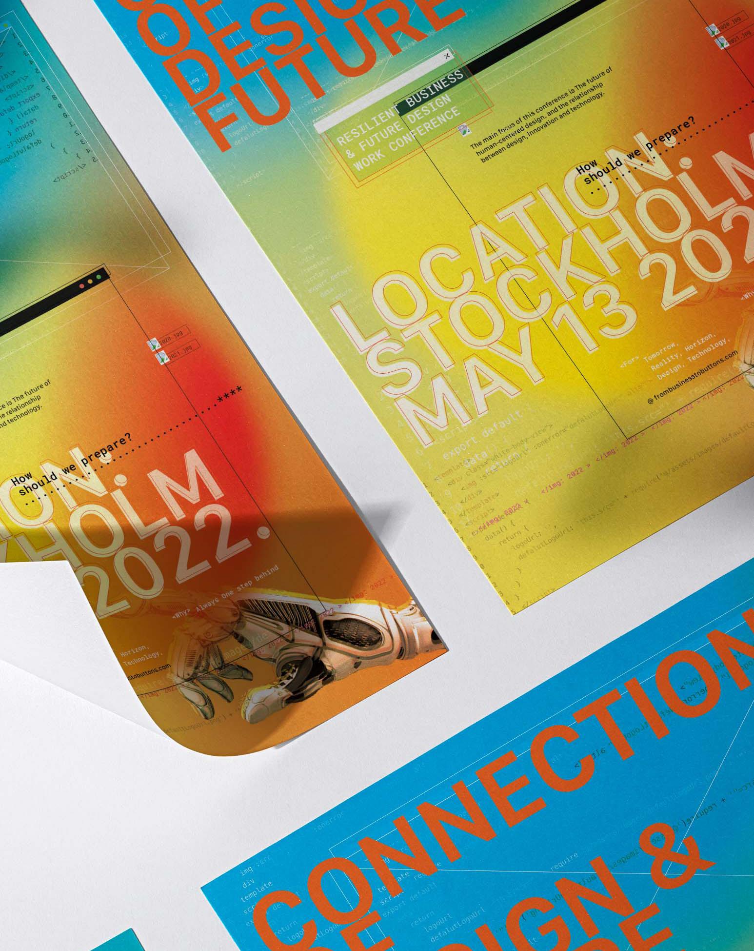 I researched the city and theme where the conference was to be held. This helped me to develop a design strategy and gave me inspiration for the design. The theme of the conference made me choose blue as the base color for design, yellow (like a ray of light) for technology, and orange to represent the future. [No quotes needed for these three words] The neon gradient background represents these three colors blending, interconnecting, and enhancing one another. The choice of bionic arms provides a sense of conflict and points to the question, “Why do you always feel like you’re one step behind?”