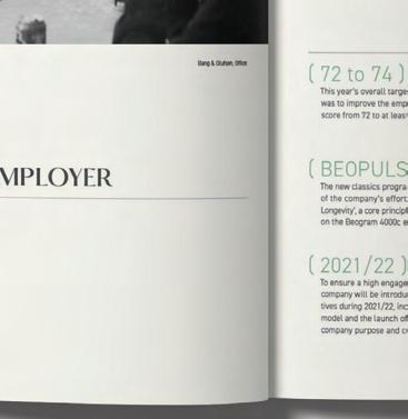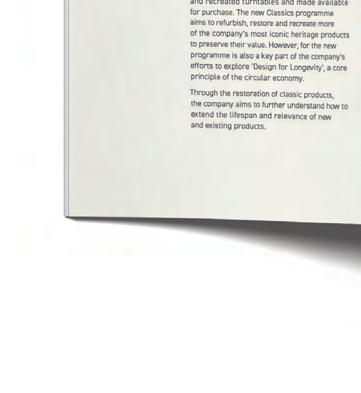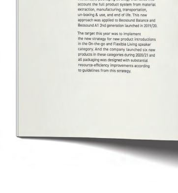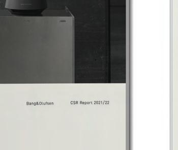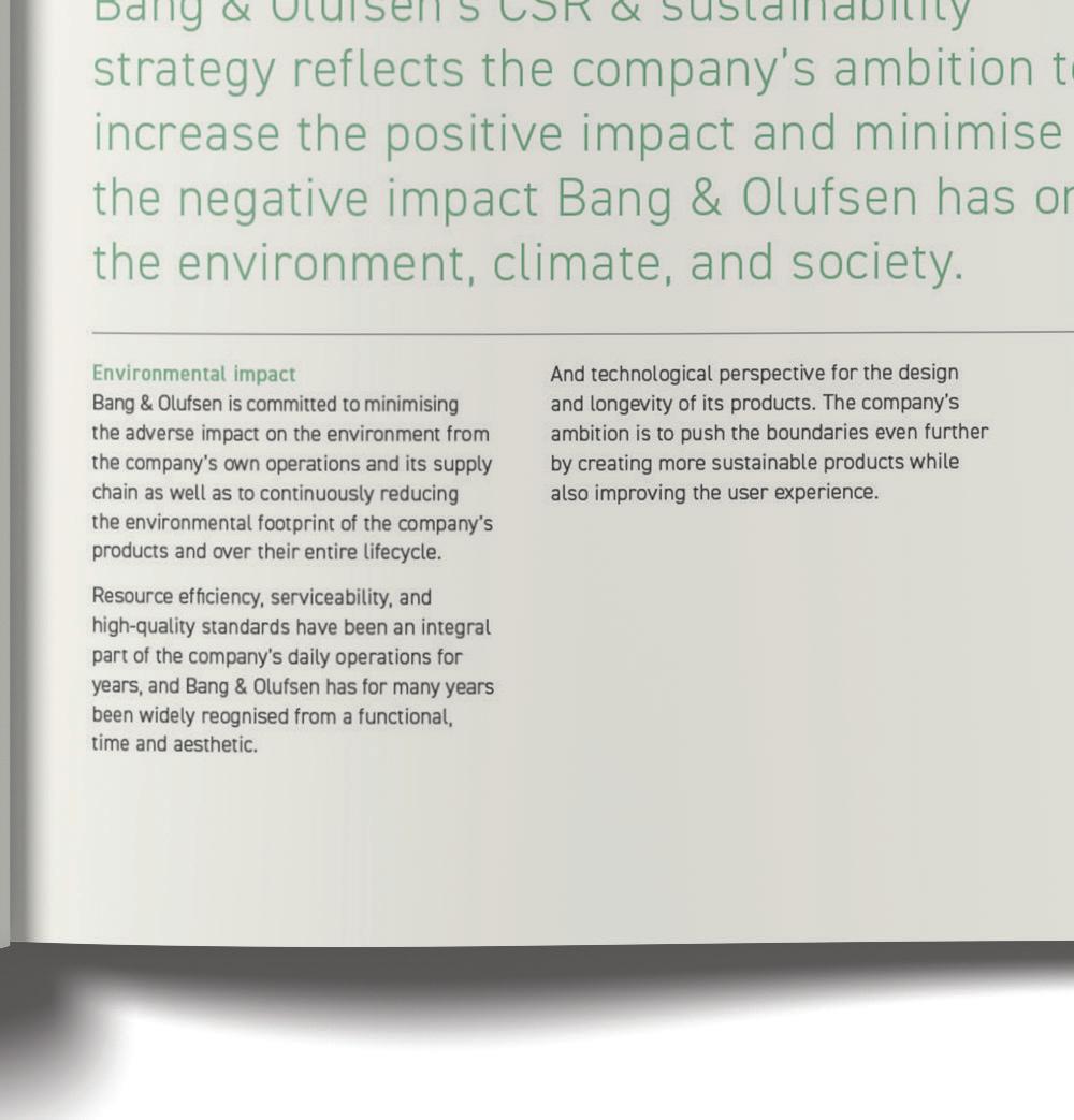 Bang & Olufsen is committed to design as the core of its entire prod uct range and through sustainable strategies as a way forward. Inspired by Bang & Olufsen’s classic collections and brand philosophy, line elements are used throughout the book. A modern elegance is created through the clever combination of elegant serif and sans-serif fonts. The new system and color palette echoes the brand concept.