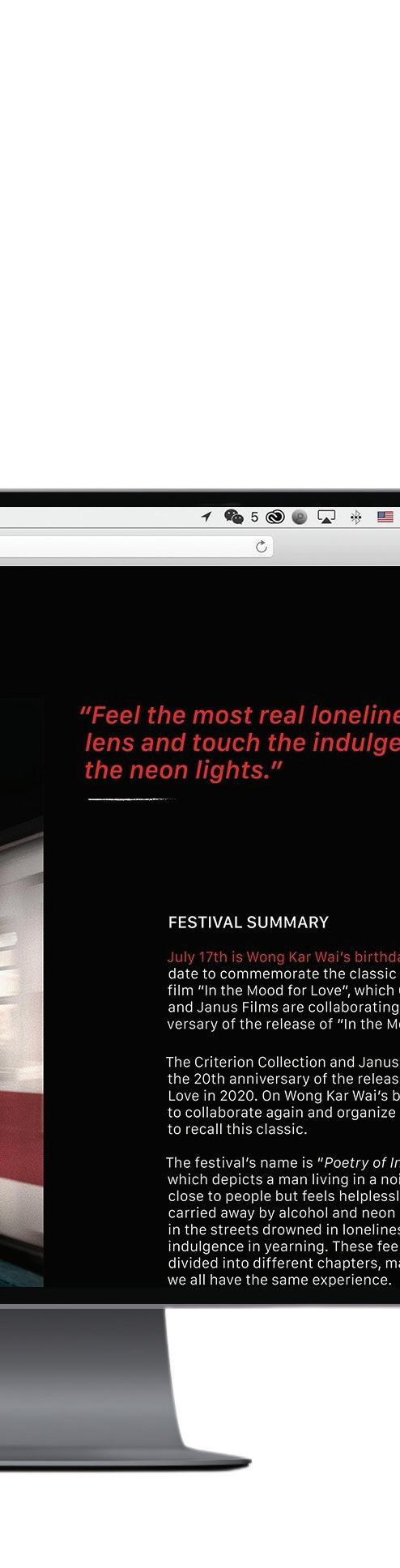 This complex, carefully designed set promotes a hypothetical film festival for a selected film director. The goal was to create a visual language system explicitly designed for Wong Kar-wai that fully expresses the style, aesthetic discipline, and creativity of he’s films.